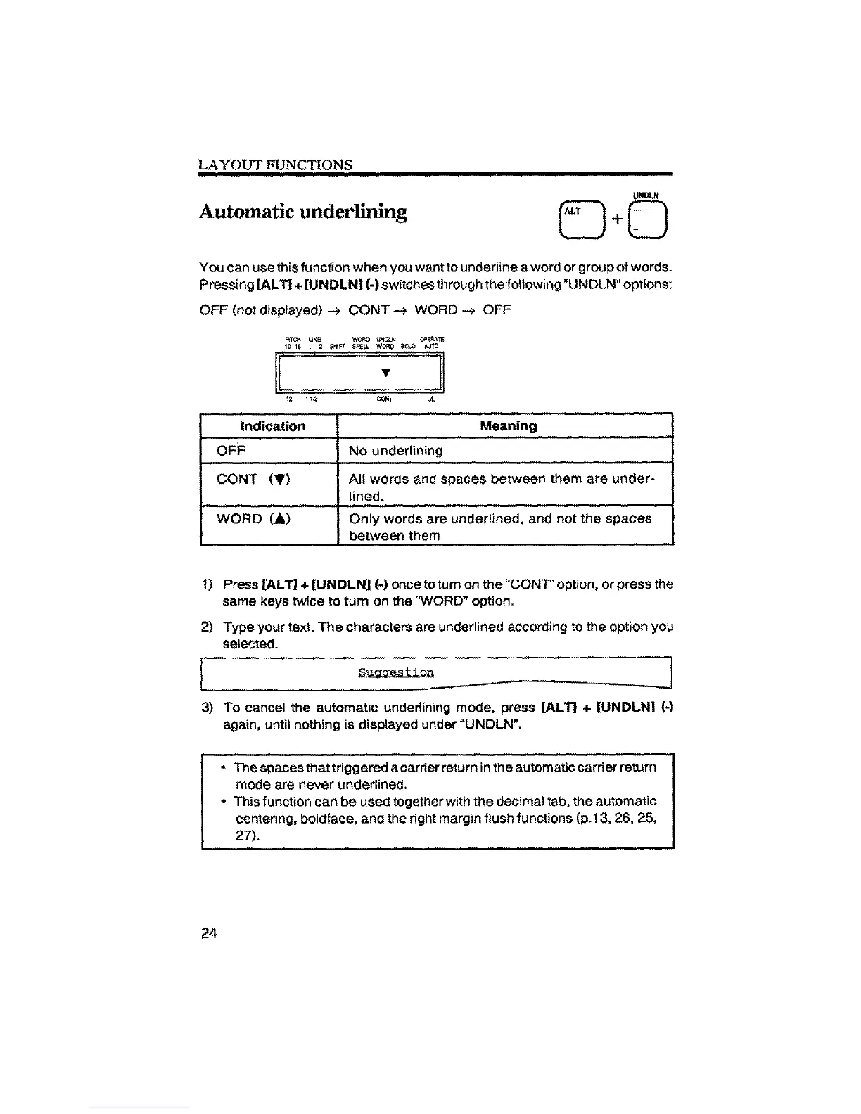 3) To cancel the automatic underlining mode, press [ALI'] + [UNDLN] 1-)