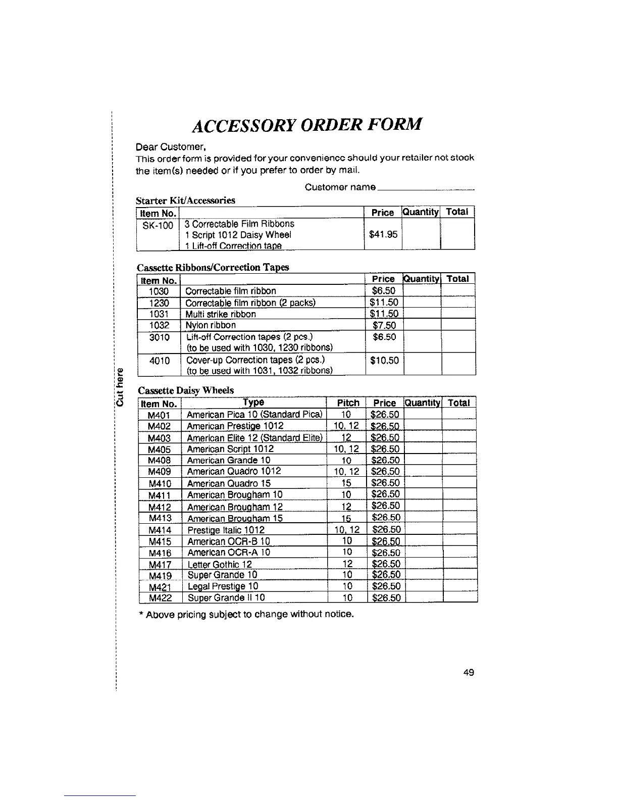 ACCESSORY ORDER FORM