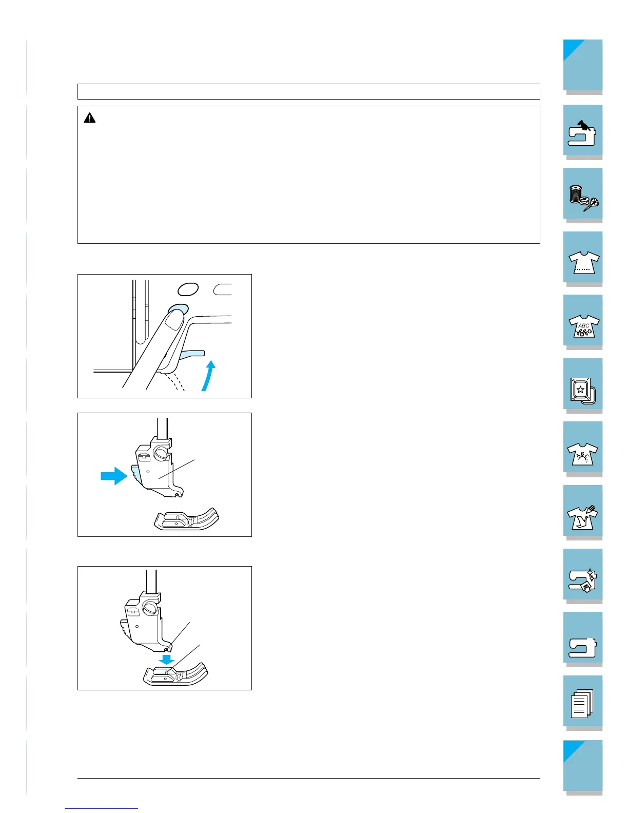 • Always turn off the power before changing the presser foot. If the power is on and the