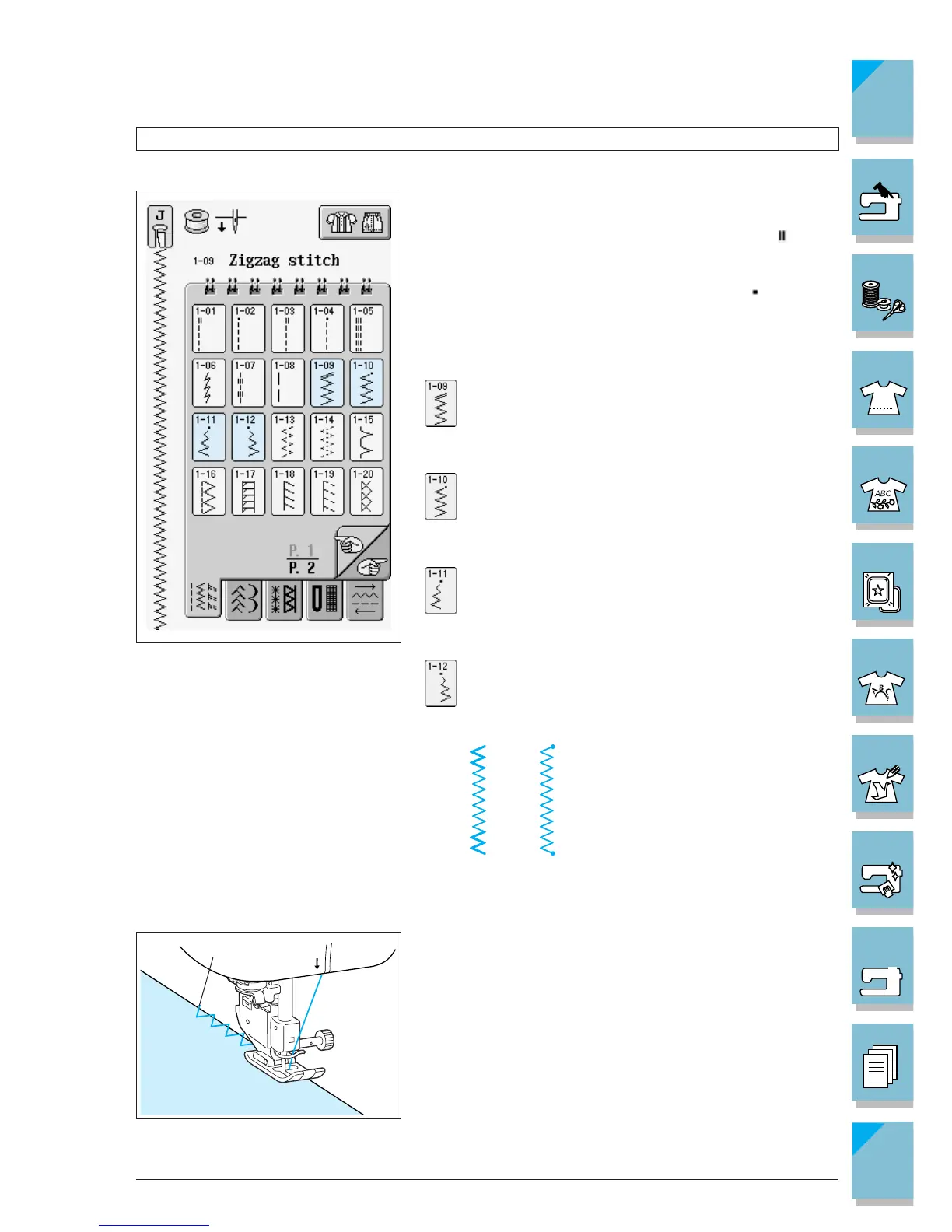 Zigzag stitches are useful for overcasting, appliqué, patchwork, and many other applications.