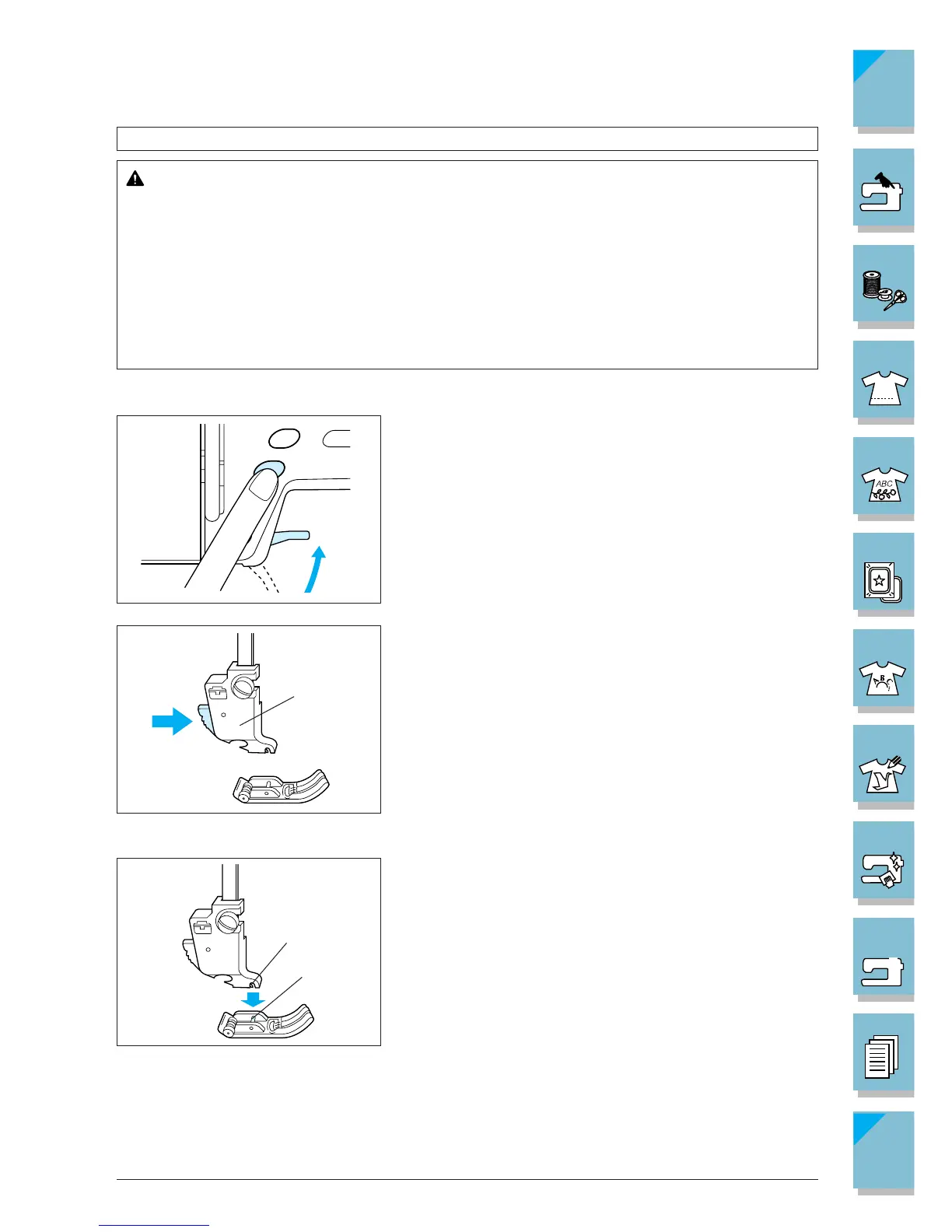 • Always turn off the power before changing the presser foot. If the power is on and the