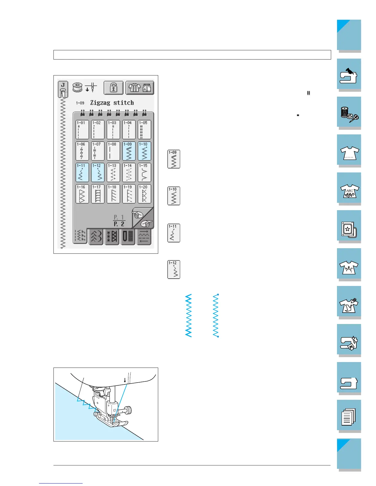 Zigzag stitches are useful for overcasting, appliqué, patchwork, and many other applications.