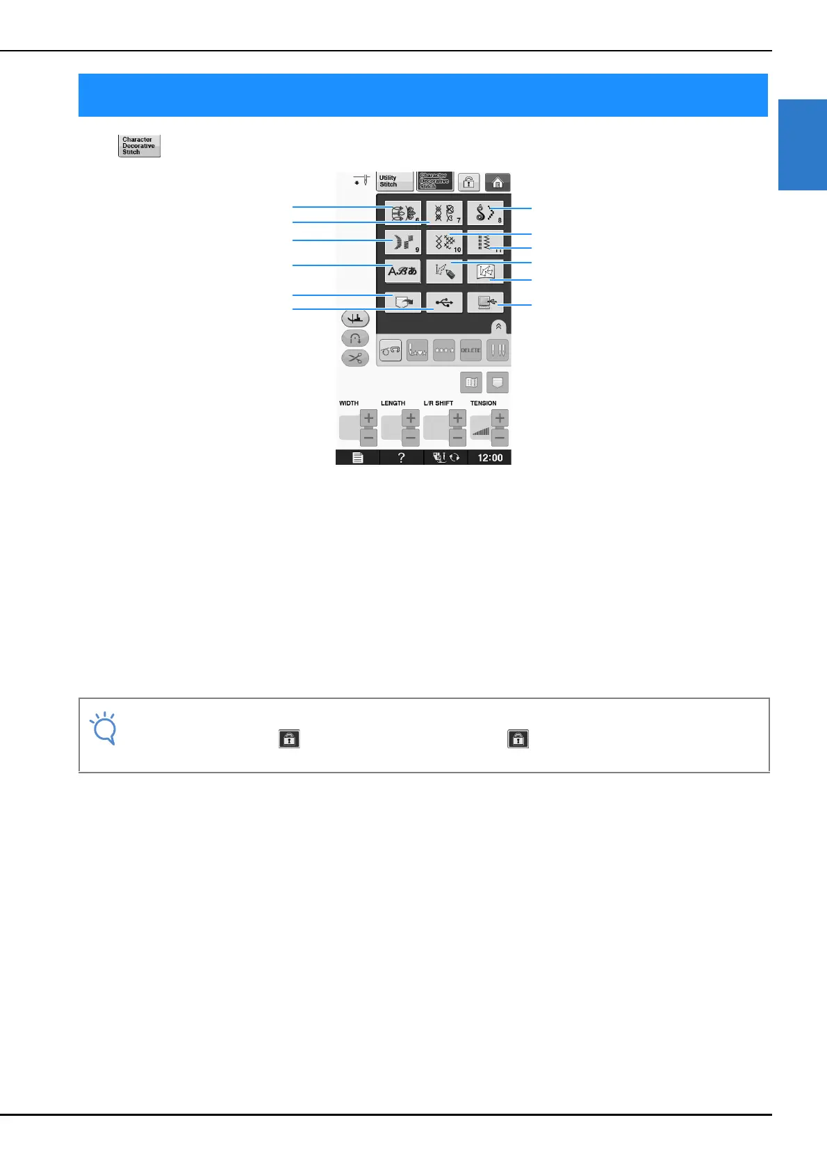 Press to display the screen below. There are 7 categories of Character/Decorative stitch patterns.