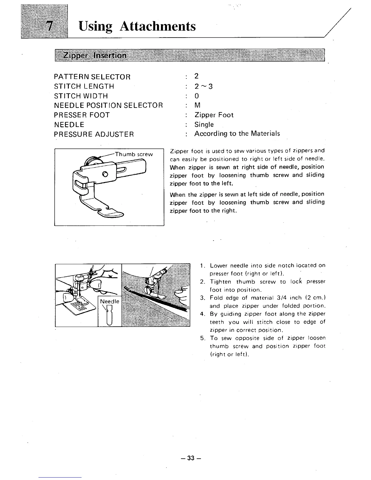 Brother VX-950 - Using Attachments; Zipper Insertion