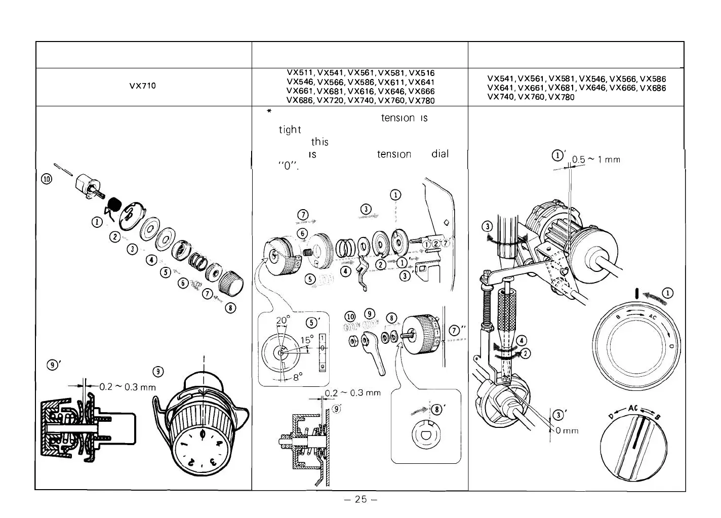 Brother VX760 - 21-1. Setting of upper thread tension dial; 21-2. Setting of upper thread tension dial; 22. Adjustment of feed dog movement at buttonhole sewing