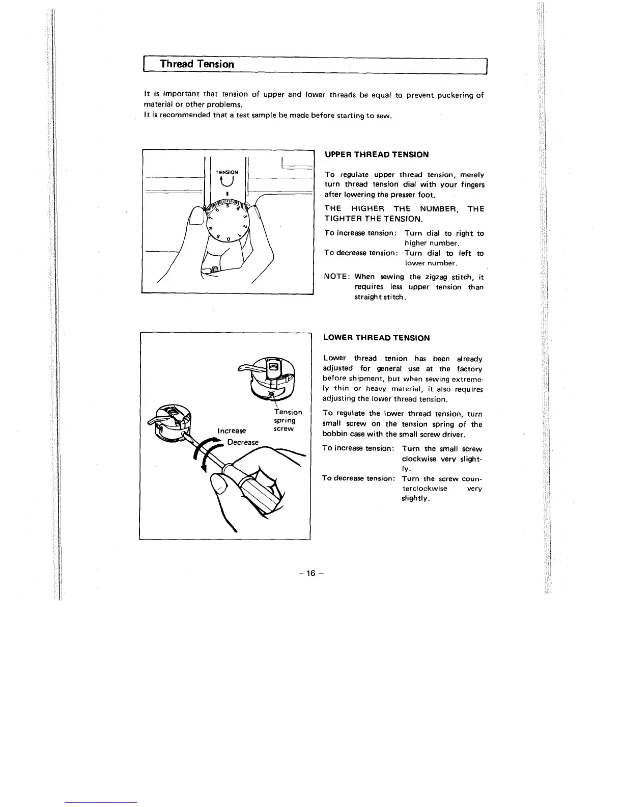 important that tension of upper and lower threads be equal to prevent puckering of