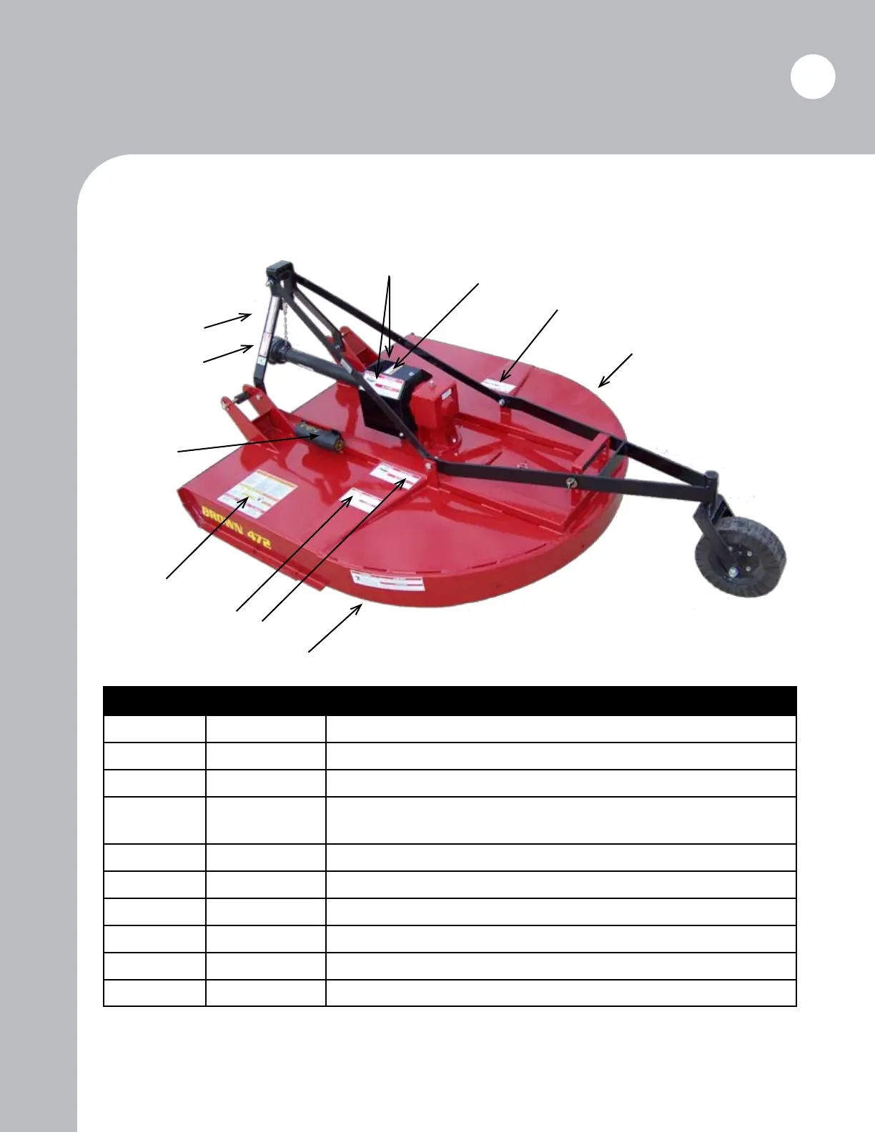 Not pictured DC-3-5-018 Safety Decal: Shield missing (placed on drive shaft, under shields).