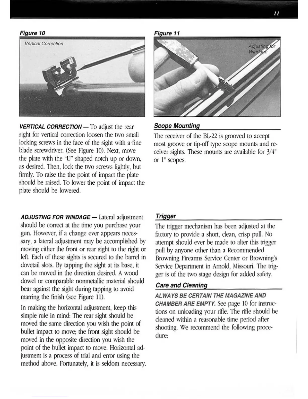 Browning BL-22 LEVEL ACTION RIFLE - Vertical Sight Correction; Horizontal Sight Correction (Windage); Accessory Mounting and Maintenance; Scope Mounting