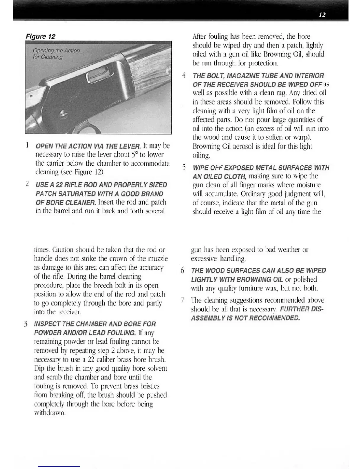 Browning BL-22 LEVEL ACTION RIFLE - Detailed Cleaning Instructions; Bore Cleaning Steps; Receiver and Bolt Cleaning; Exterior Metal and Wood Care