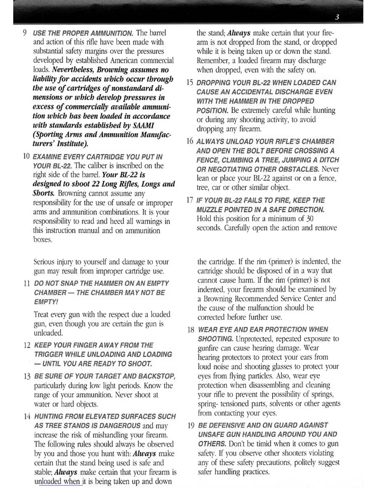 Browning BL-22 LEVEL ACTION RIFLE - Use Proper Ammunition; Inspect Cartridges; Avoid Dry Firing; Finger Off Trigger