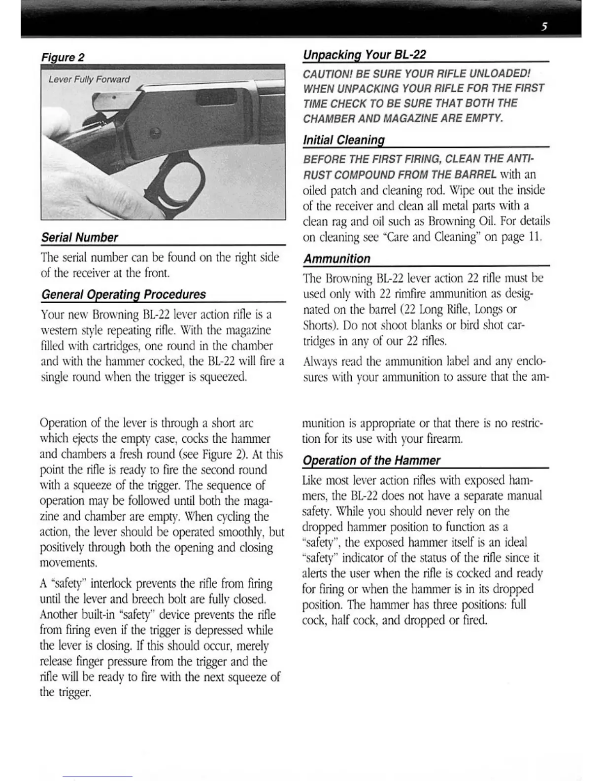 Browning BL-22 LEVEL ACTION RIFLE - Unpacking and Initial Setup; Unpacking Precautions; Initial Cleaning Procedure; Ammunition Requirements