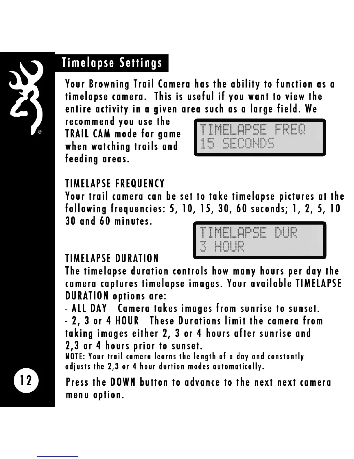 Browning BTC-1XR - Timelapse Settings; Timelapse Frequency Options; Timelapse Duration Options