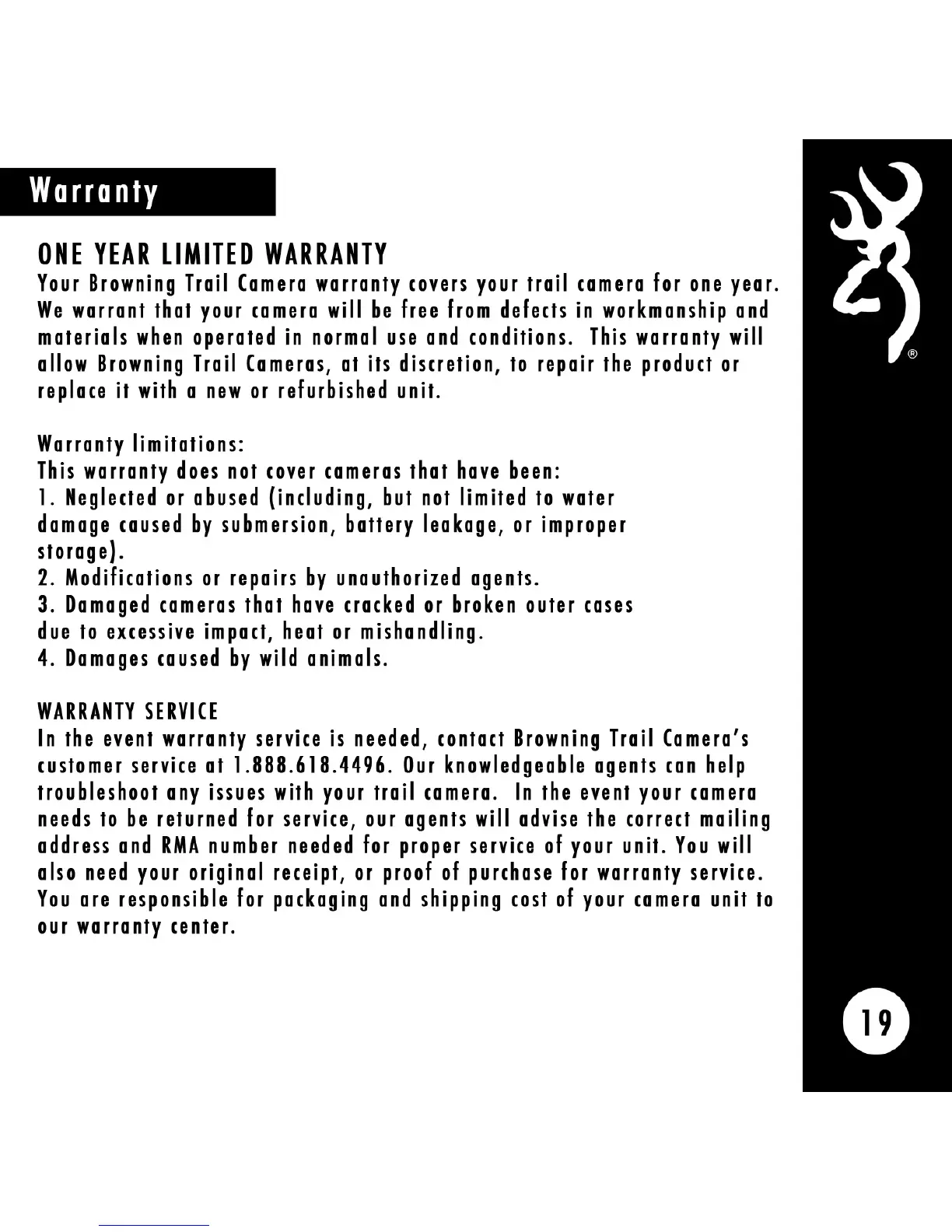 Browning BTC-1XR - Warranty Information; One Year Limited Warranty Details; Warranty Service Process