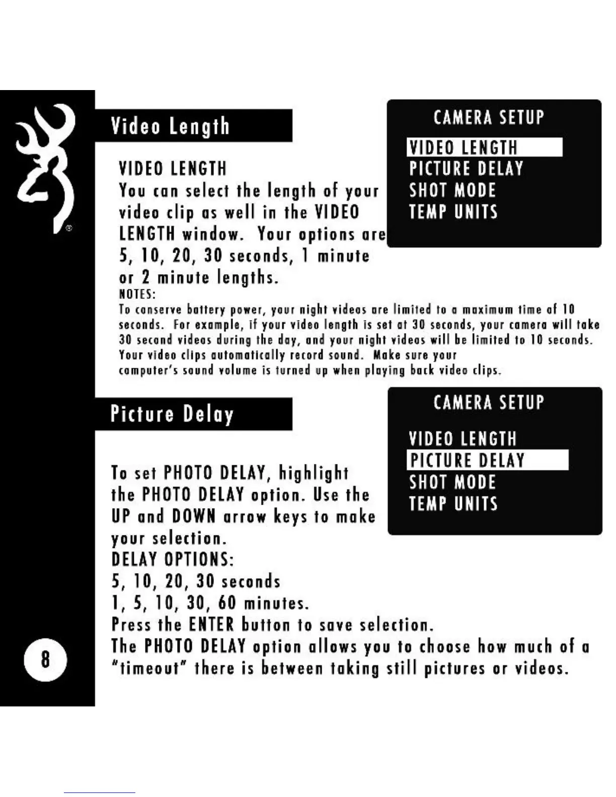 Browning BTC-3 - Video Length and Picture Delay; Video Length Configuration; Picture Delay Settings