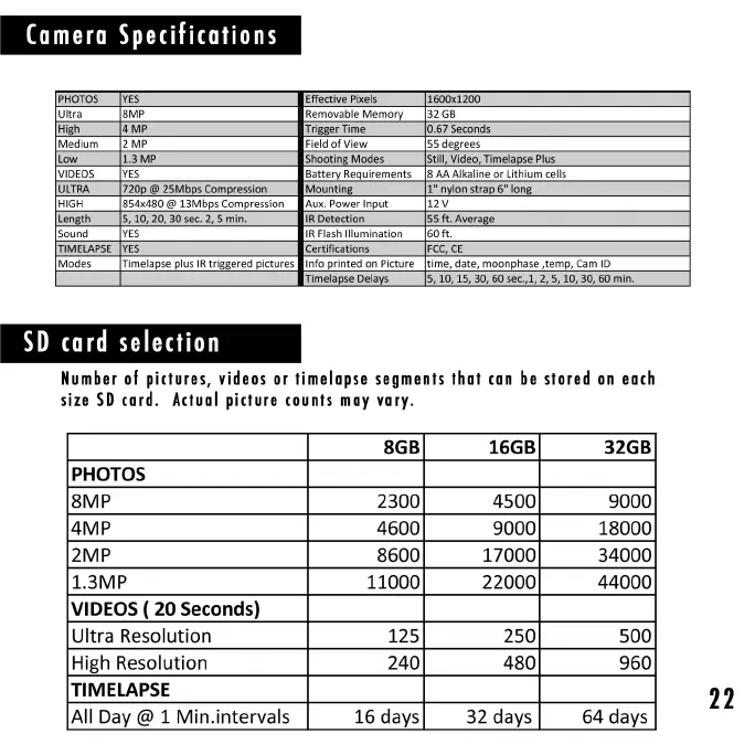 Browning BTC-4 - Camera Specifications; SD Card Selection Guide