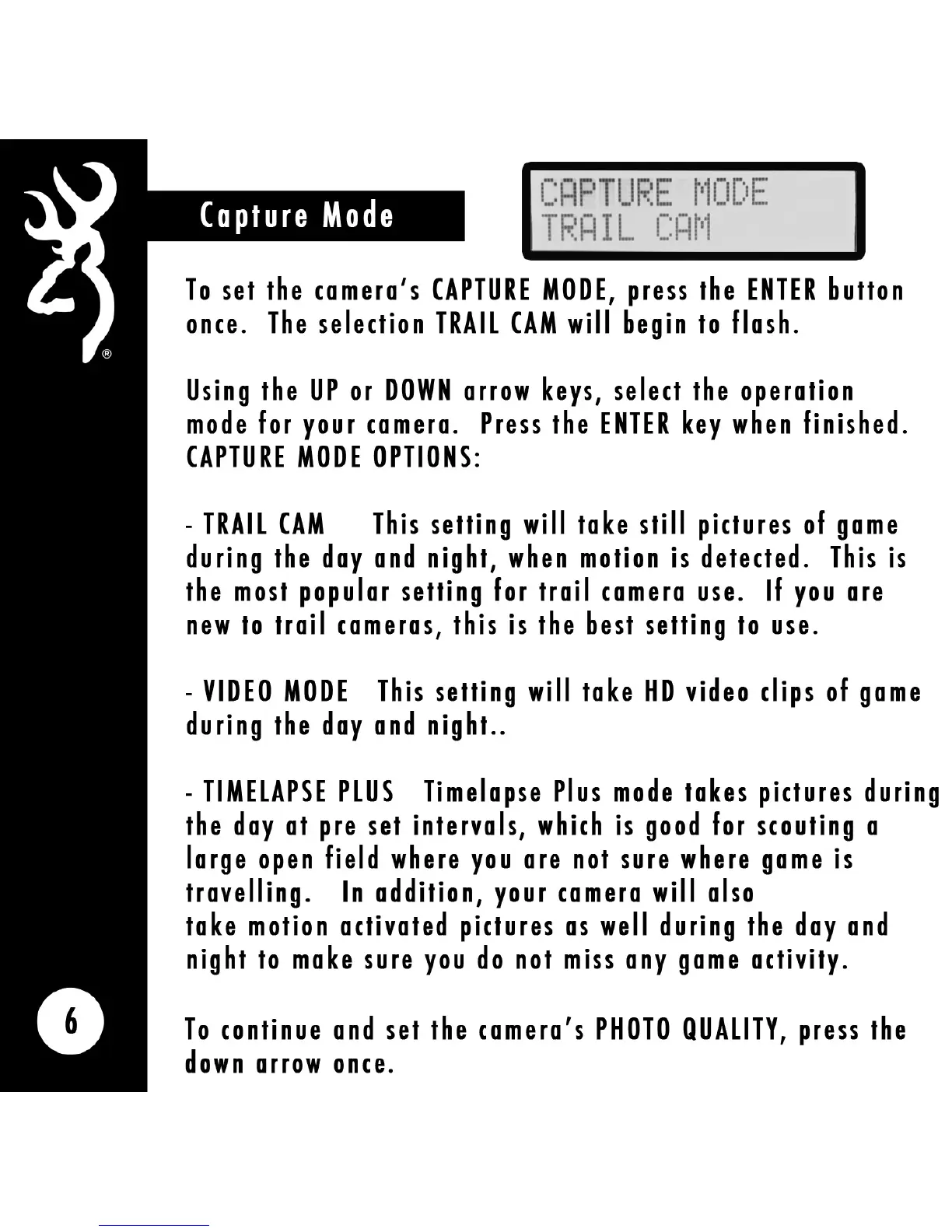Browning BTC-6HDE - Capture Mode; Trail Cam; Video Mode; Timelapse Plus