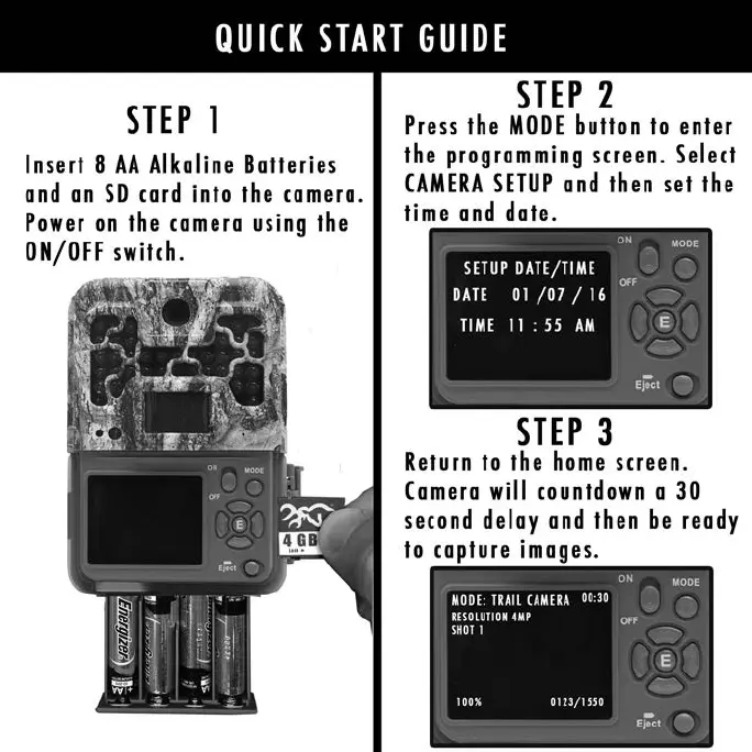 Browning BTC-7FHD-P - Quick Start Guide; Step 1: Initial Camera Setup; Step 2: Set Time and Date; Step 3: Camera Ready State
