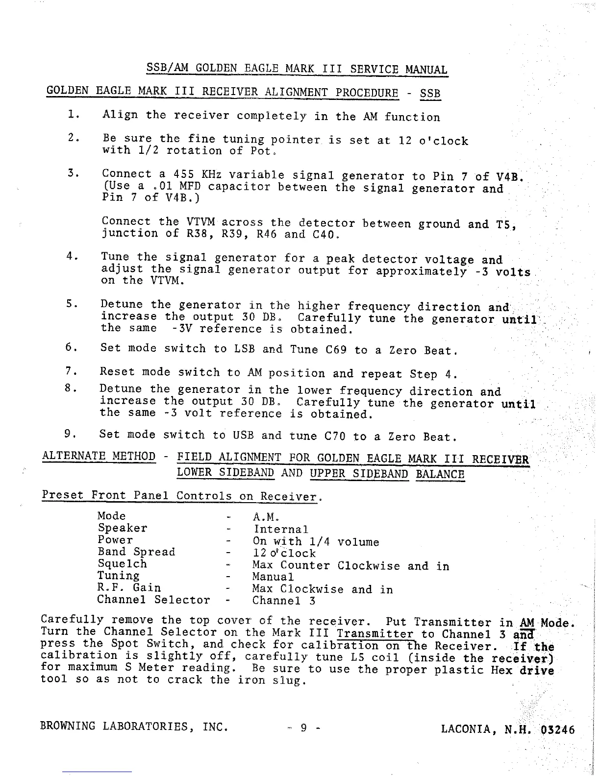 Browning Golden Eagle Mark III - SSB RECEIVER ALIGNMENT; SSB RECEIVER ALIGNMENT ALTERNATE METHOD
