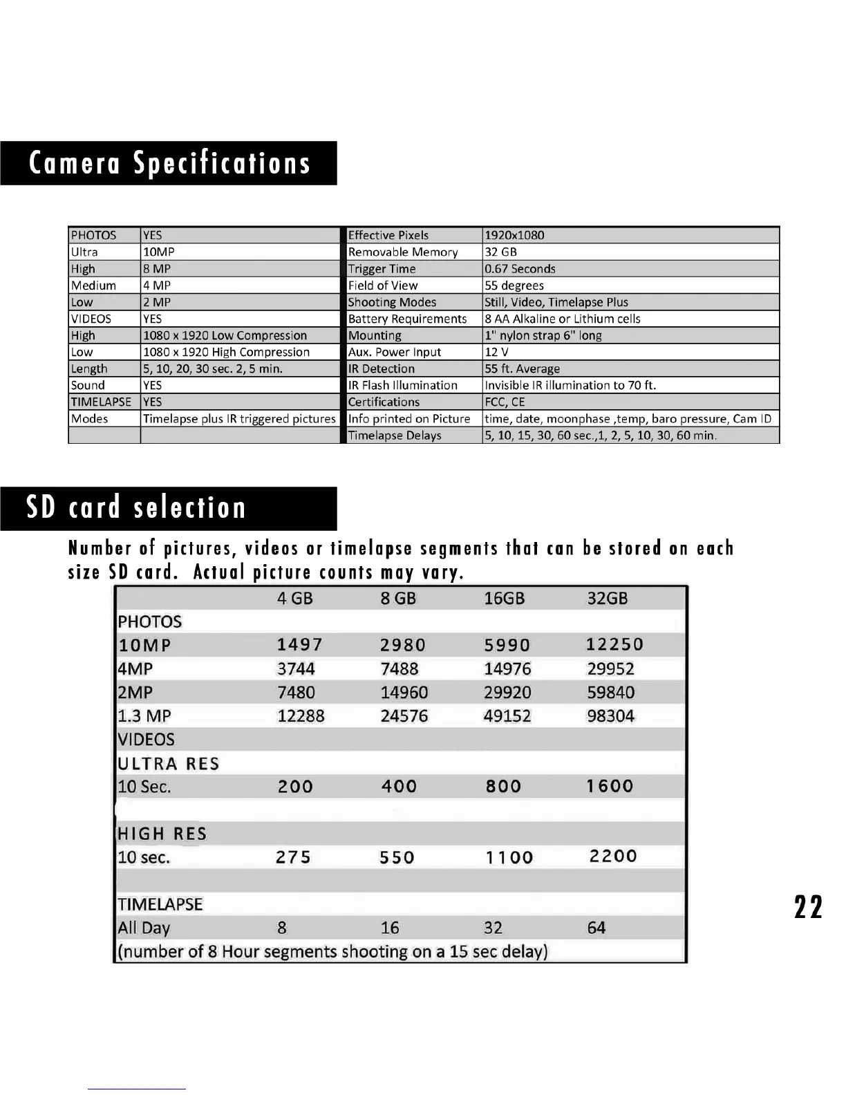 Browning Specops Series BTC-8FHD - Technical Specifications; Camera Specifications; SD Card Capacity Chart