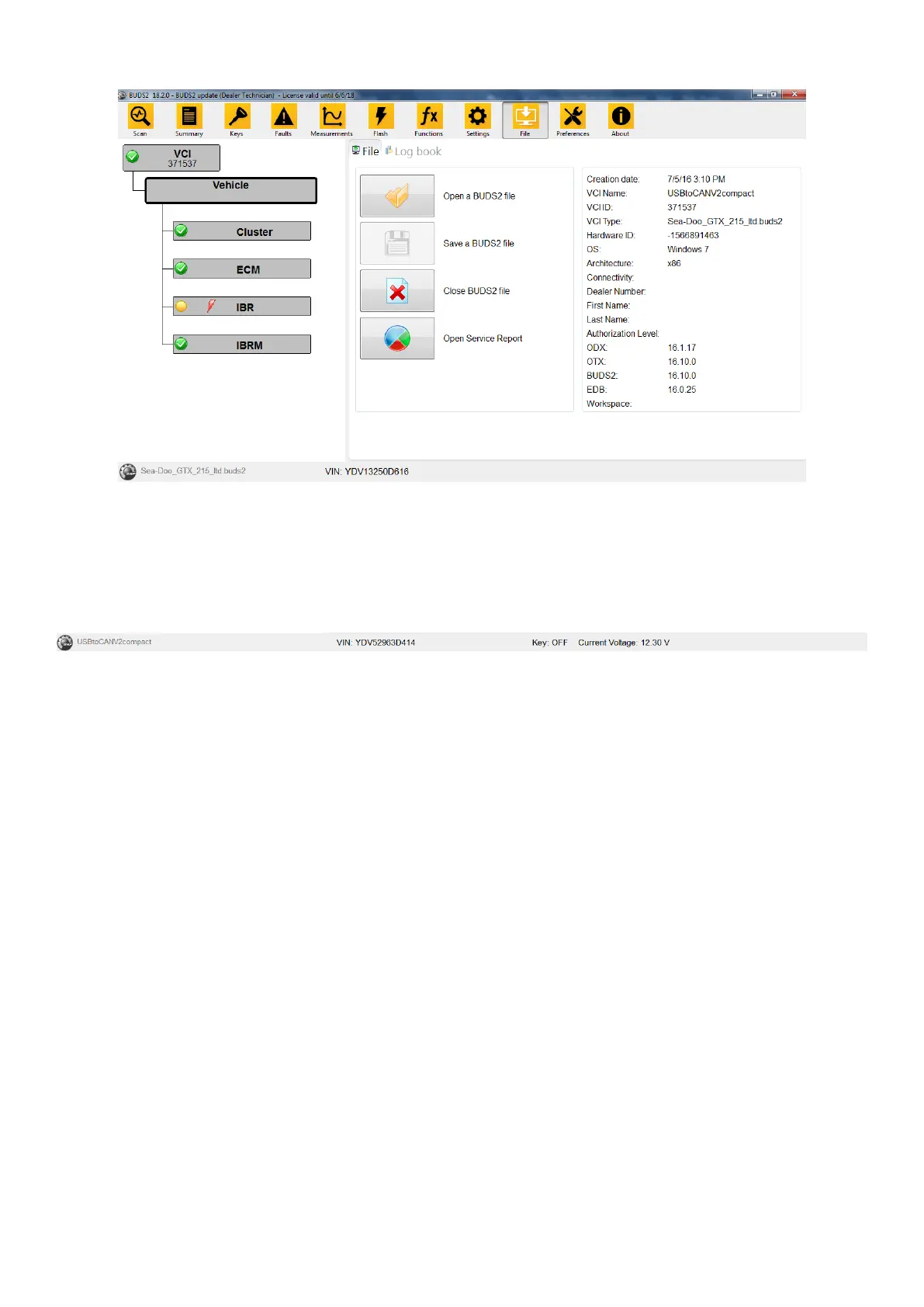 In both file and VCI mode, BUDS2 brings us to the main screen below:
