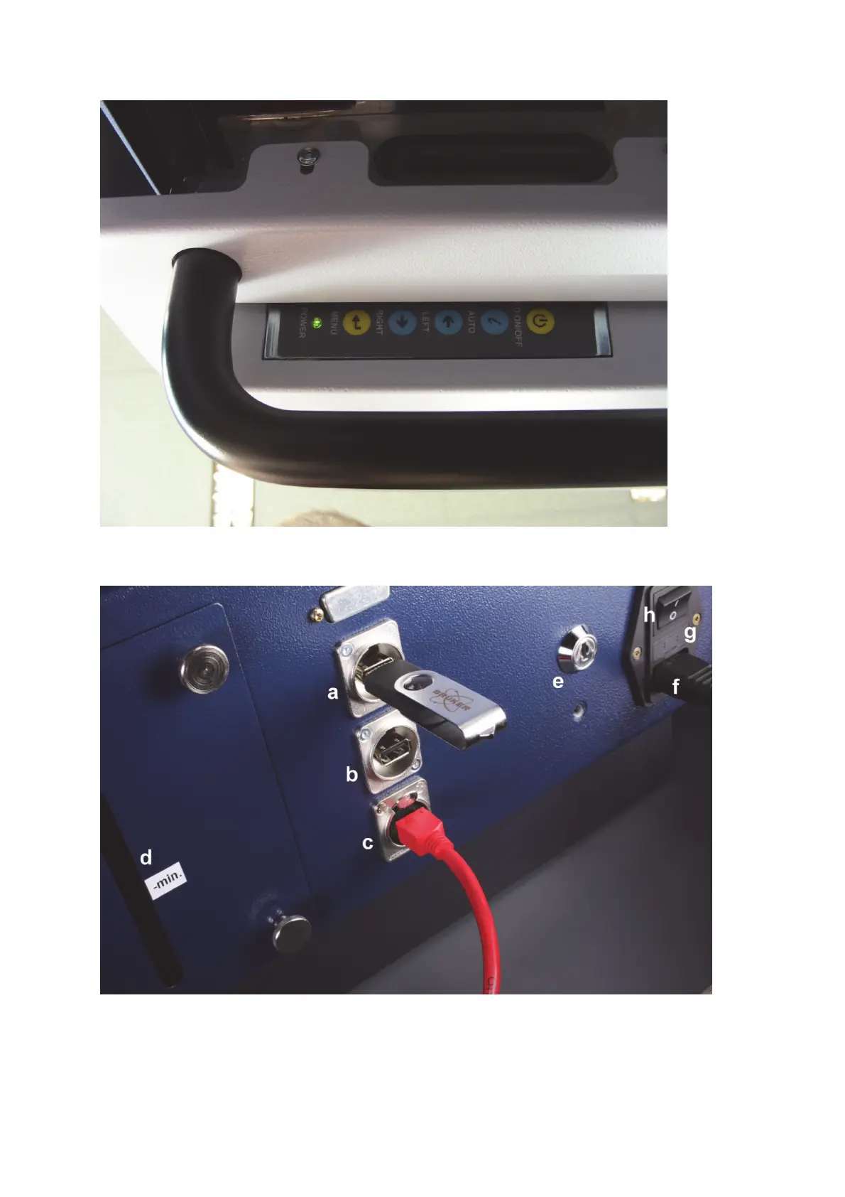 Fig. 115 Back side of D2 PHASER housing: (a) and (b) are USB ports, (c) is LAN port, (d) is level