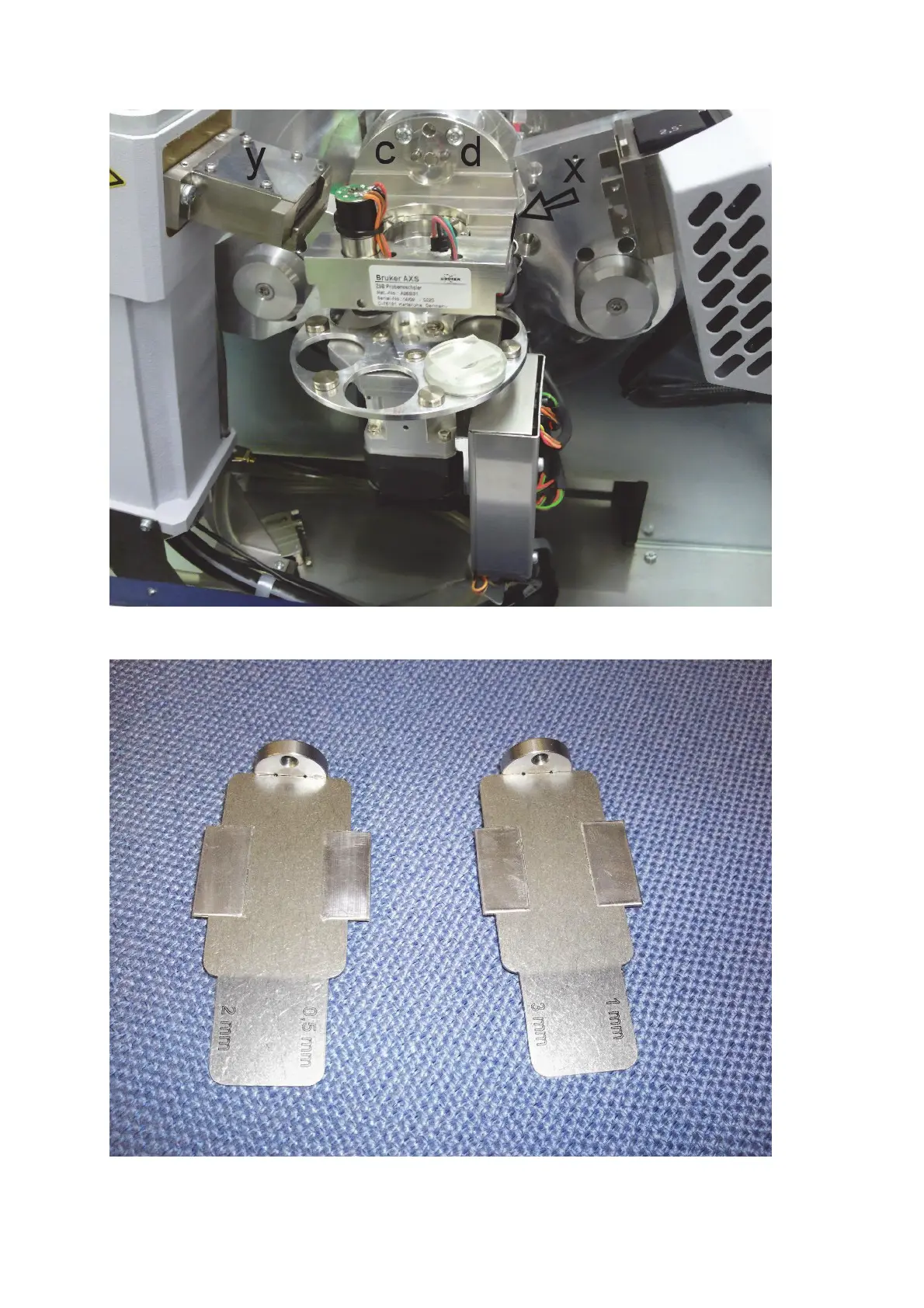 Fig 139 Sample changer is fixed by 4 screws (c) and (d). (x) is the primary beam stop and (y) the lid
