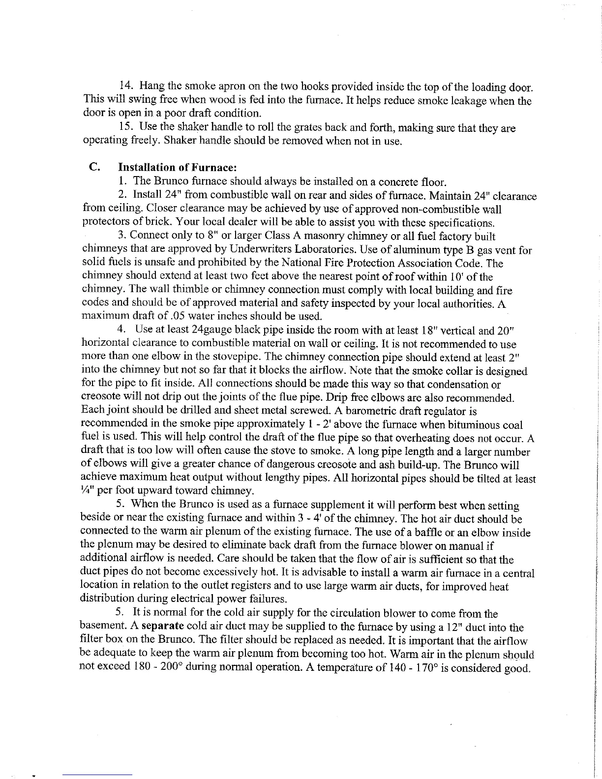 Brunco 120 - Installation of Furnace; Clearance Requirements; Chimney and Venting; Furnace Placement and Ducting