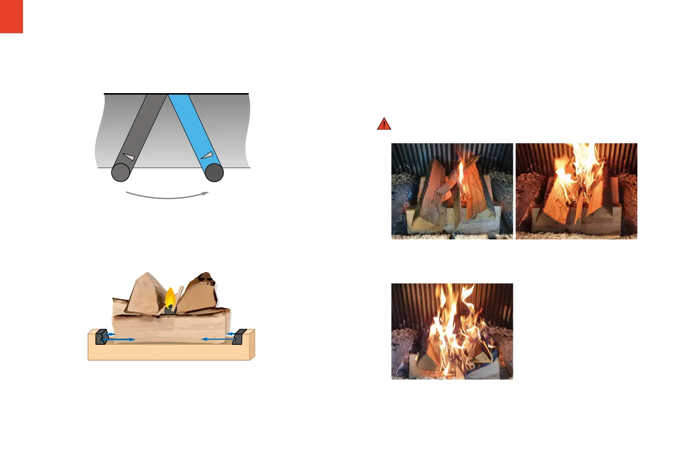 Anordnung der Holzscheite in der Feuermulde sowie Lage von Anzünder und Anzünd-