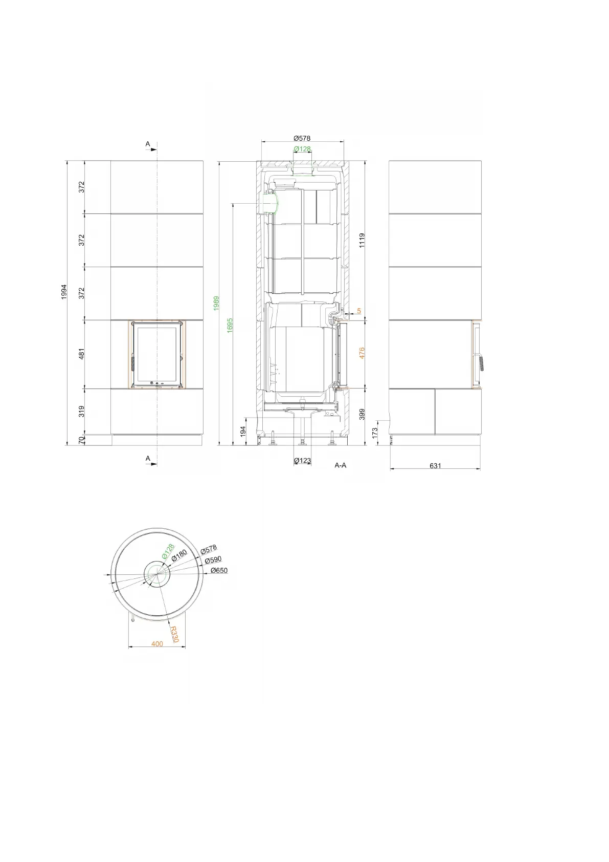 Frames/ flue gas outlet connection/ combustion air supply connection/ front variants/ support bearing are marked in col-
