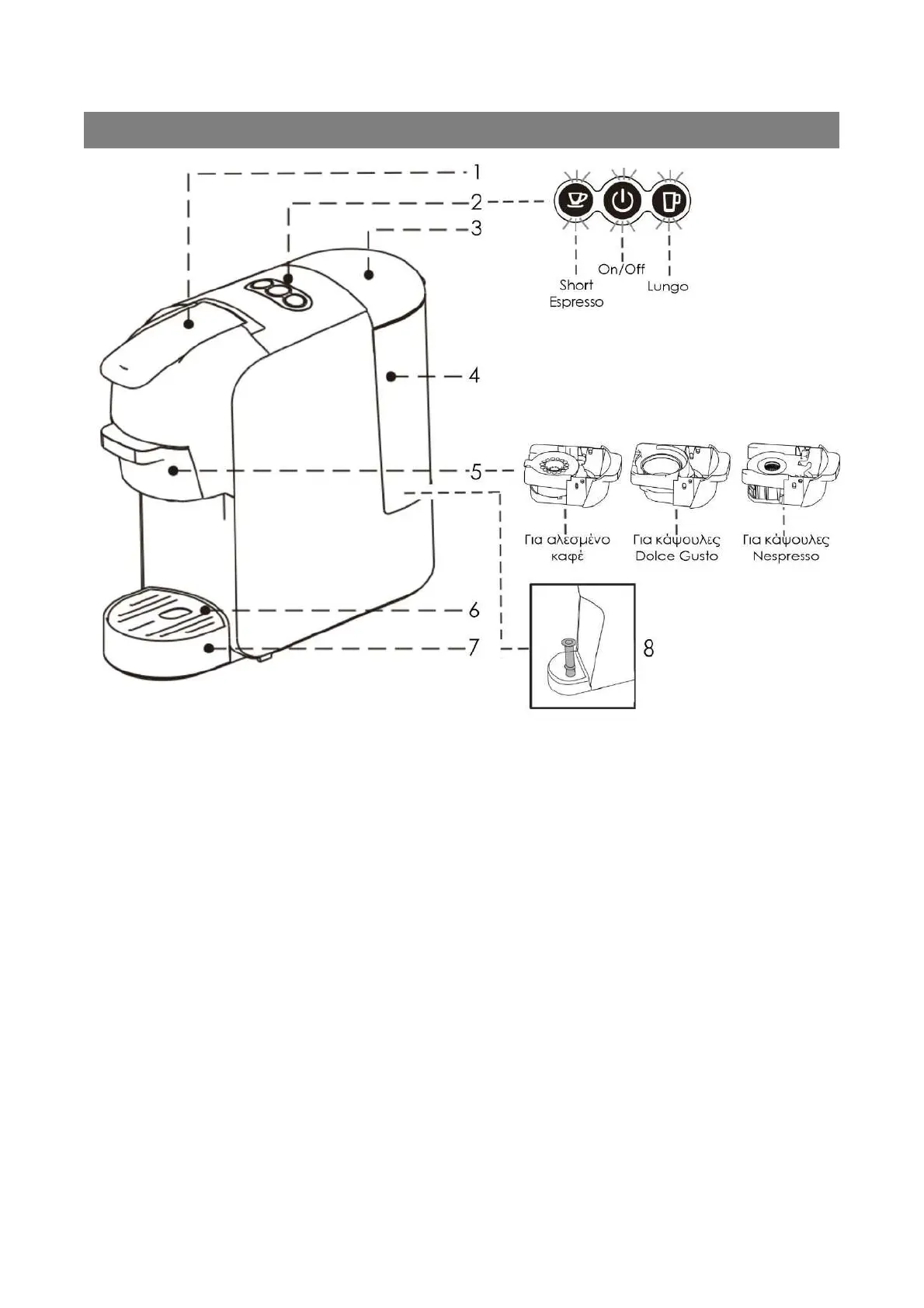 2. Κουμπιά λειτουργιών (On/Off - Short Espresso - Lungo)