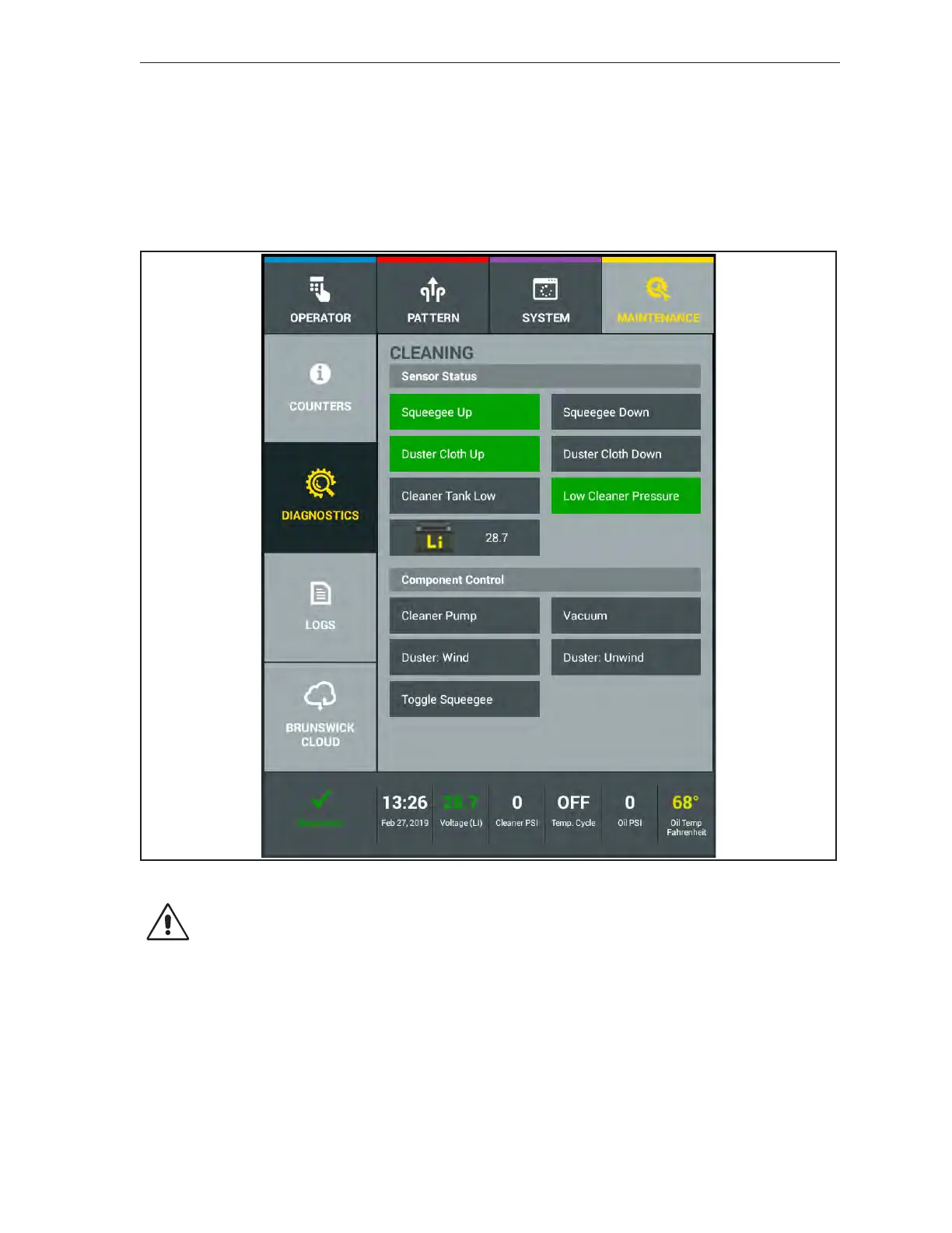 The “Cleaning” diagnostics screen is split into 2 sections. The top section displays the sensors and