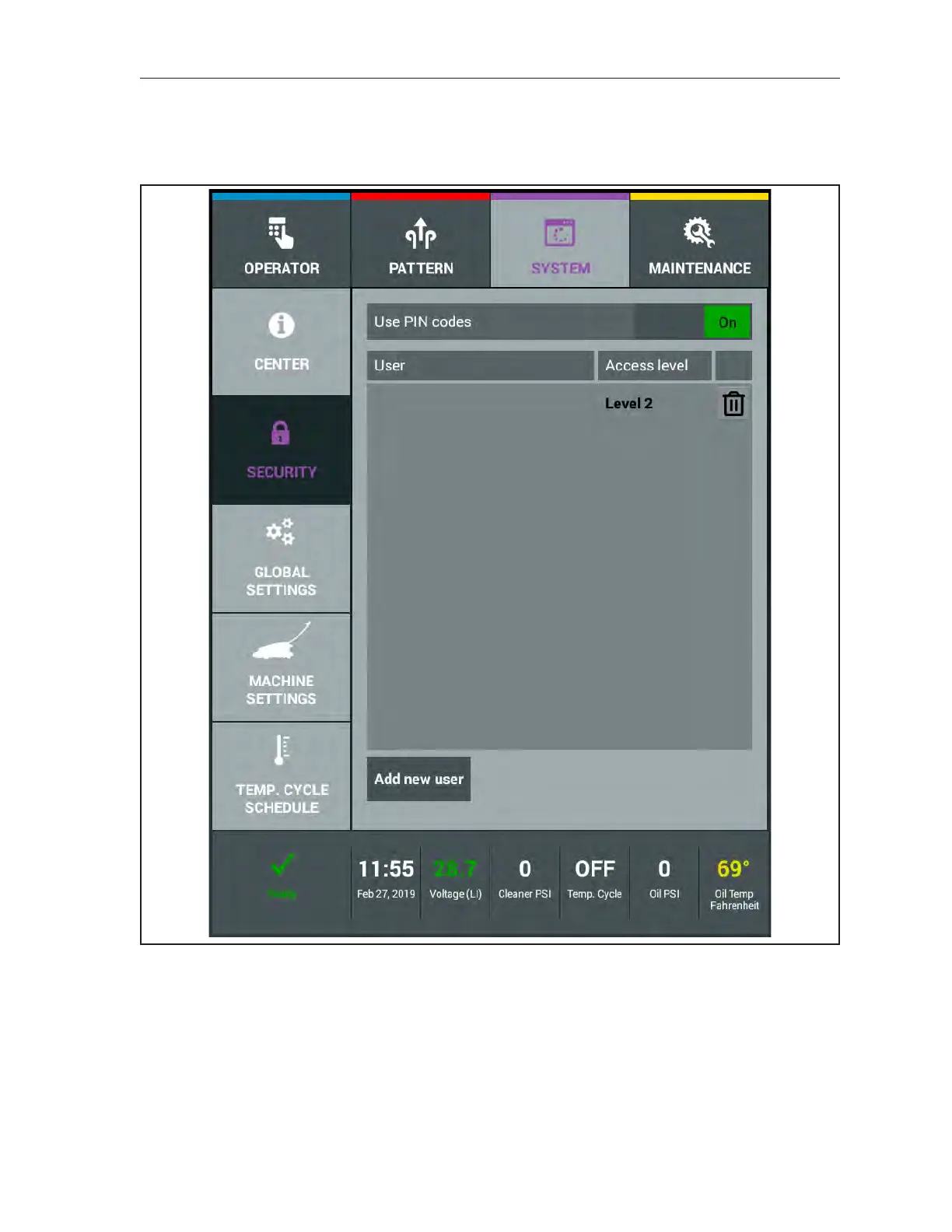 Level 1 user has access to override patterns and certain parameters in the operator screen. This