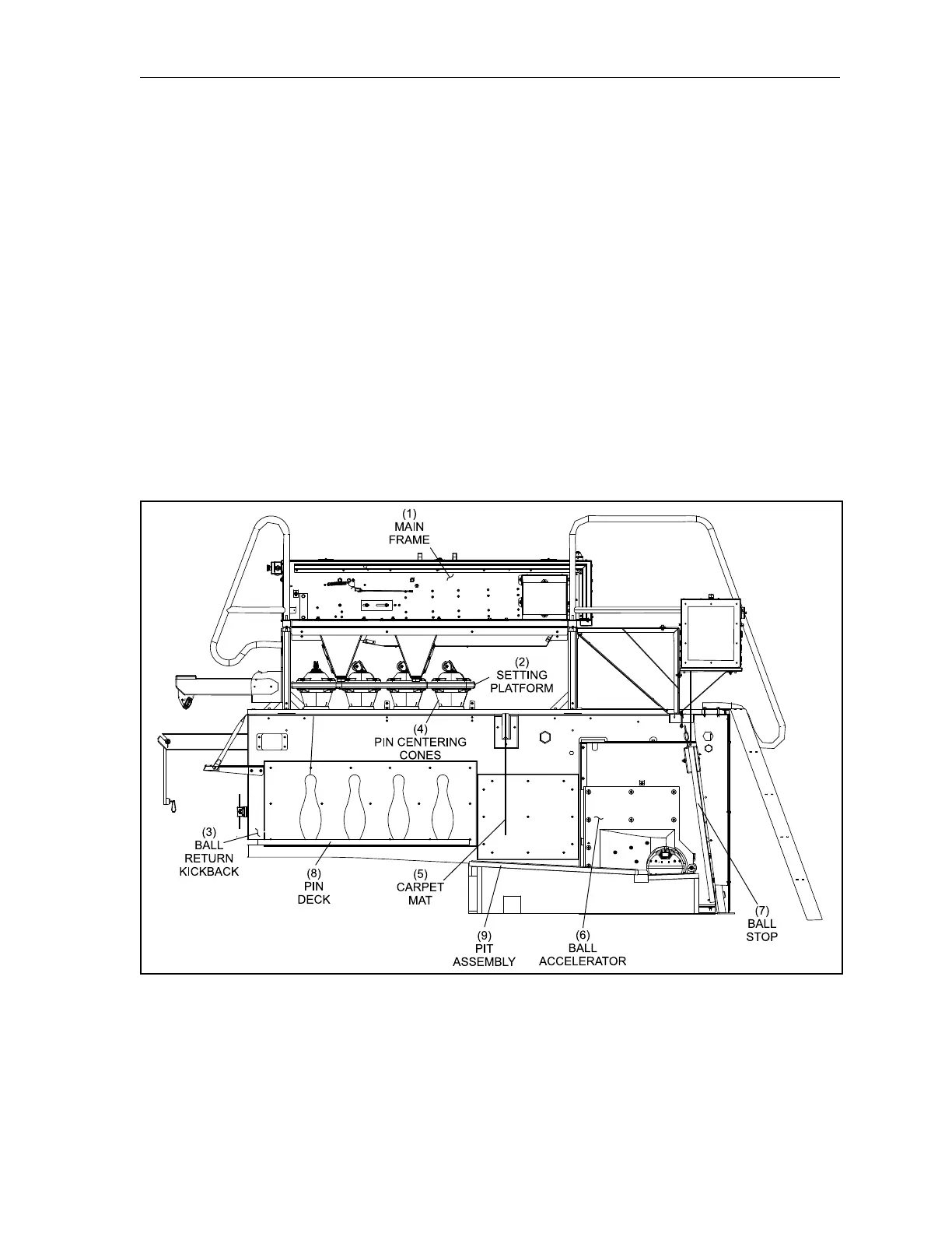 (7) BALL STOP (8) PIN DECK (9) PIT ASSEMBLY