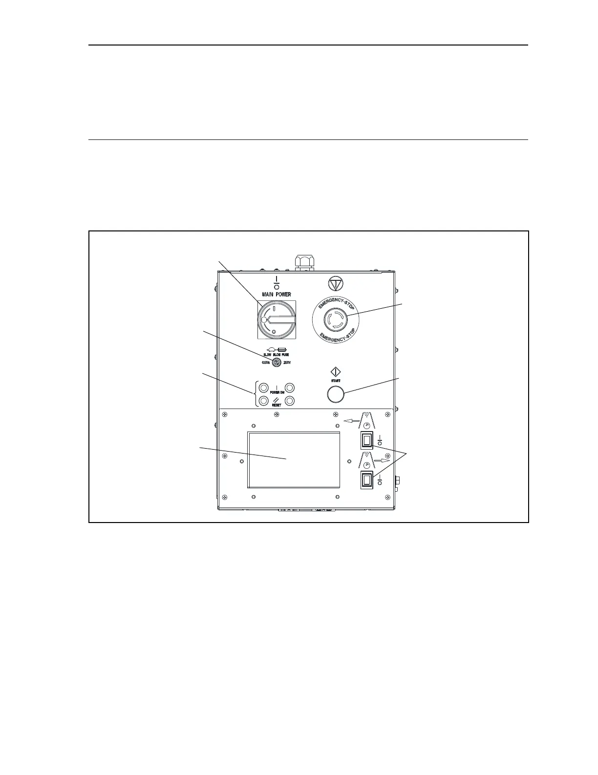 Controls include a main power switch, emergency o switch, stop/run switches, a start push-button,