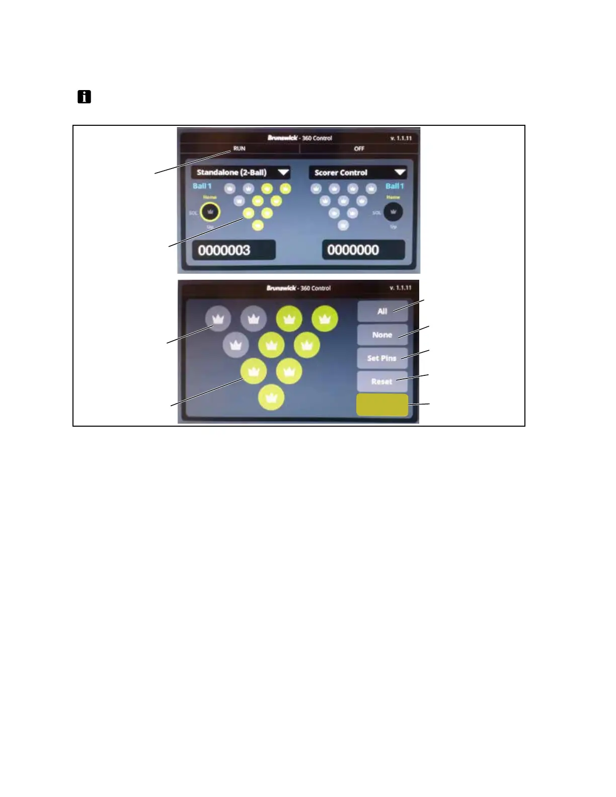 (1) Run Mode - The pinsetter must be in the “Run” mode to access the Pinspot Menu.