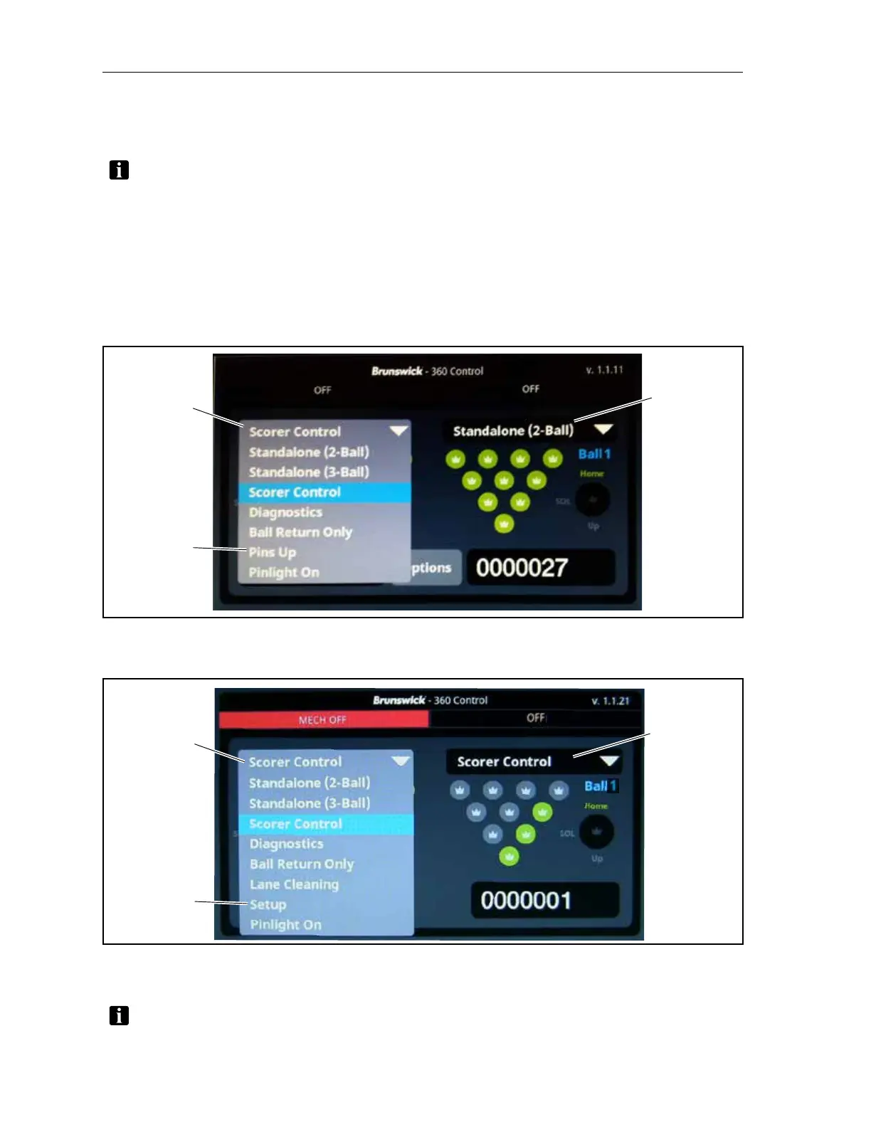 b. On the Pinsetter Mode drop down menu, select Pins Up or Setup. Figures4-8aand4-8b.