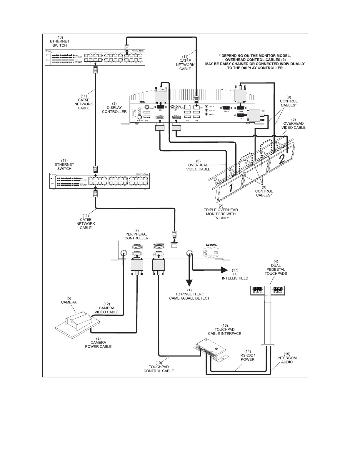 (1) TO PINSETTER / CAMERA (2) TRIPLE OVERHEAD MONITORS (3) DISPLAY CONTROLLER