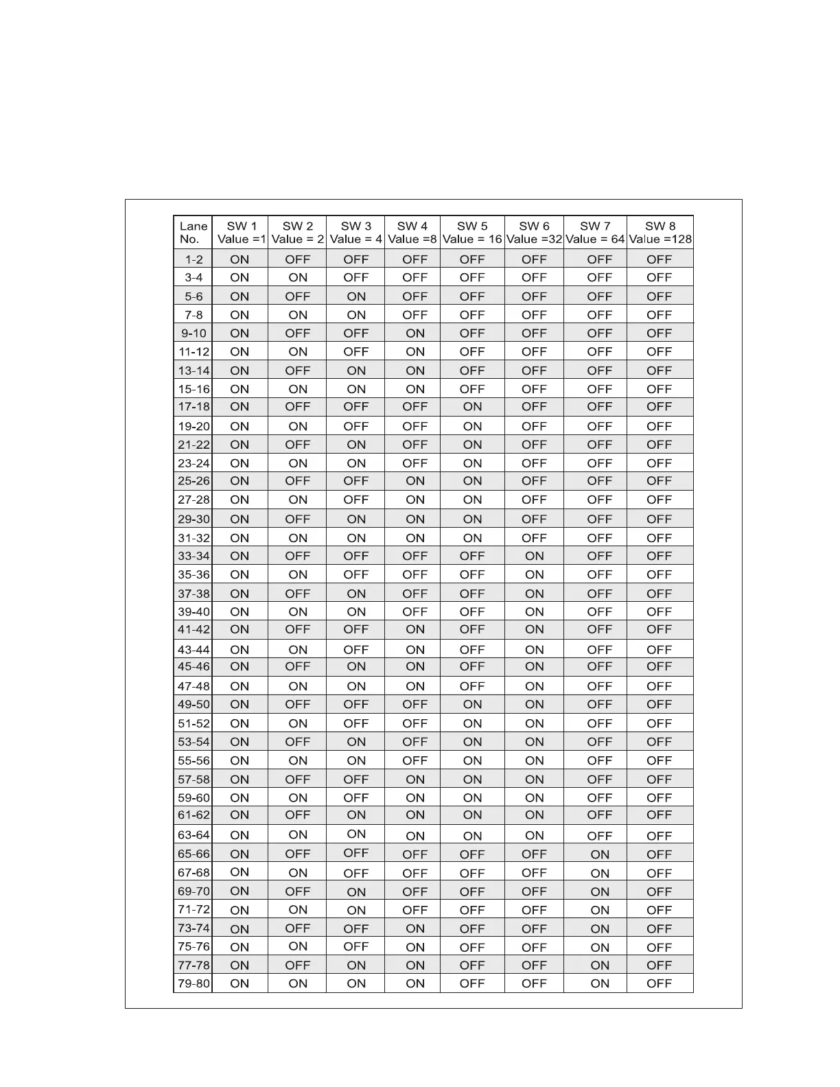 (14) Board Address 1 - Bank of 8 switches used to assign the lane ID. Refer to gure titled
