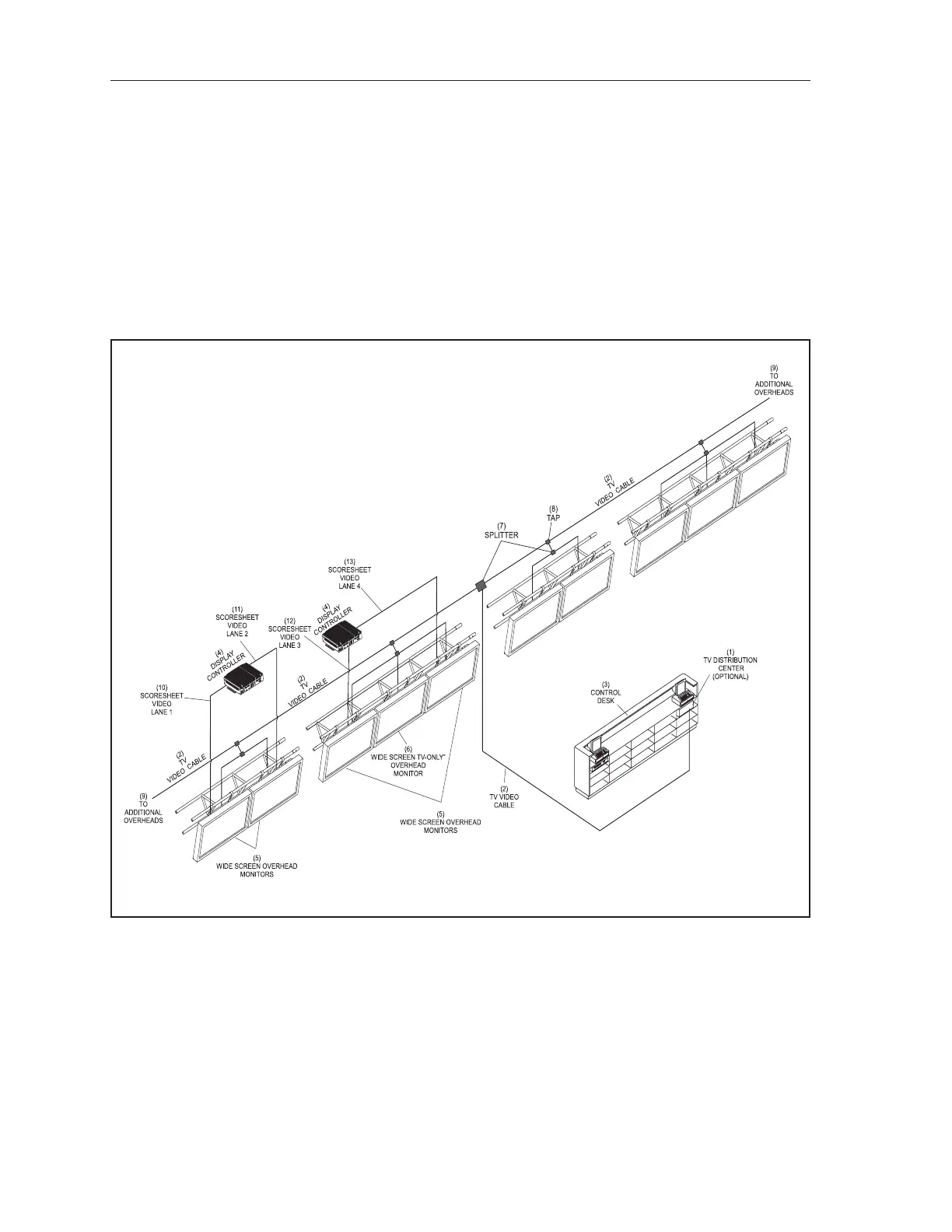 Optional high denition TV video is provided to the overhead screens through coaxial cables originated