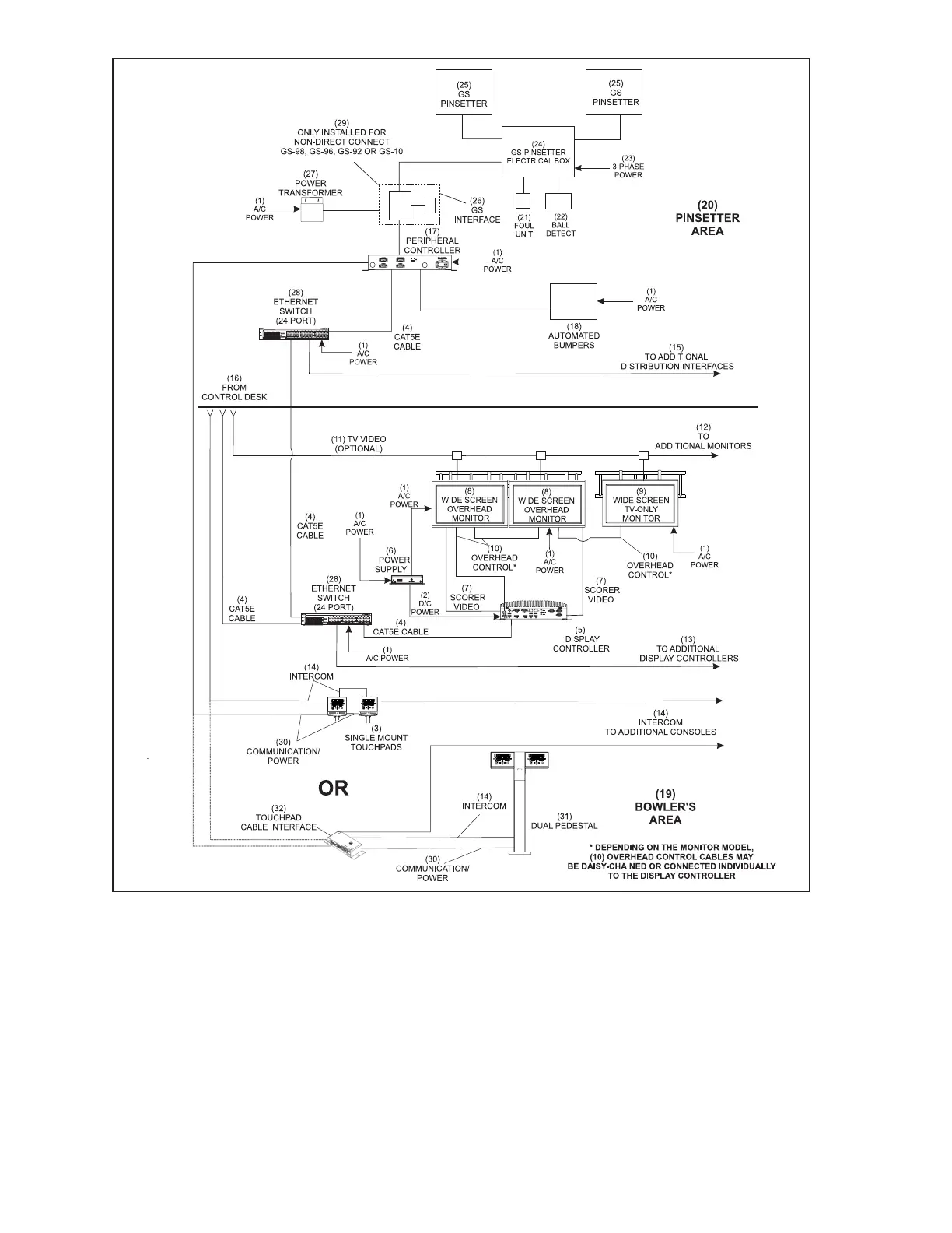 (25) GS PINSETTER (27) POWER TRANSFORMER (28) ETHERNET SWITCH (24 PORT)