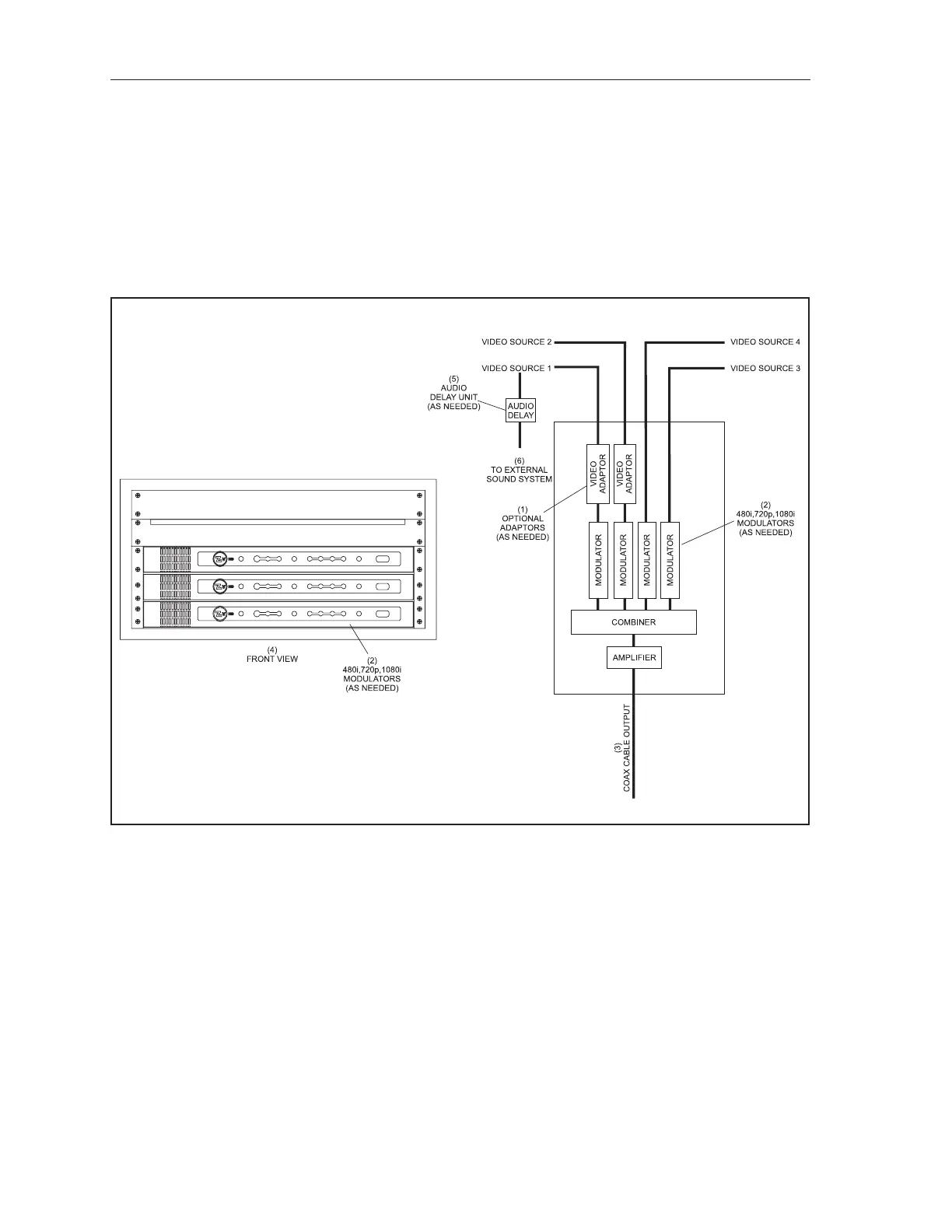 4) FRONT VIEW (5) AUDIO DELAY UNIT (AS NEEDED) (6) TO EXTERNAL SOUND SYSTEM