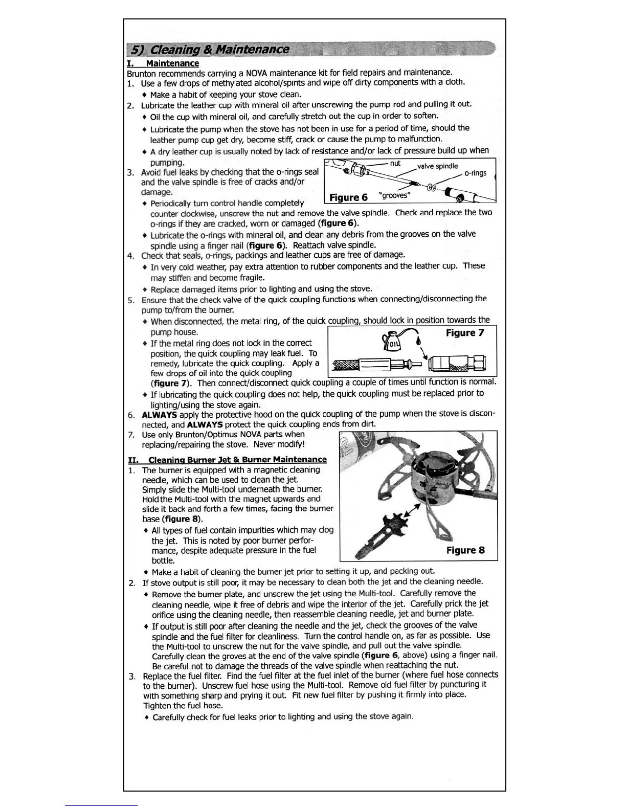 Brunton Nova - Cleaning and Maintenance; General Stove Maintenance; O-ring and Valve Spindle Care; Burner Jet Cleaning