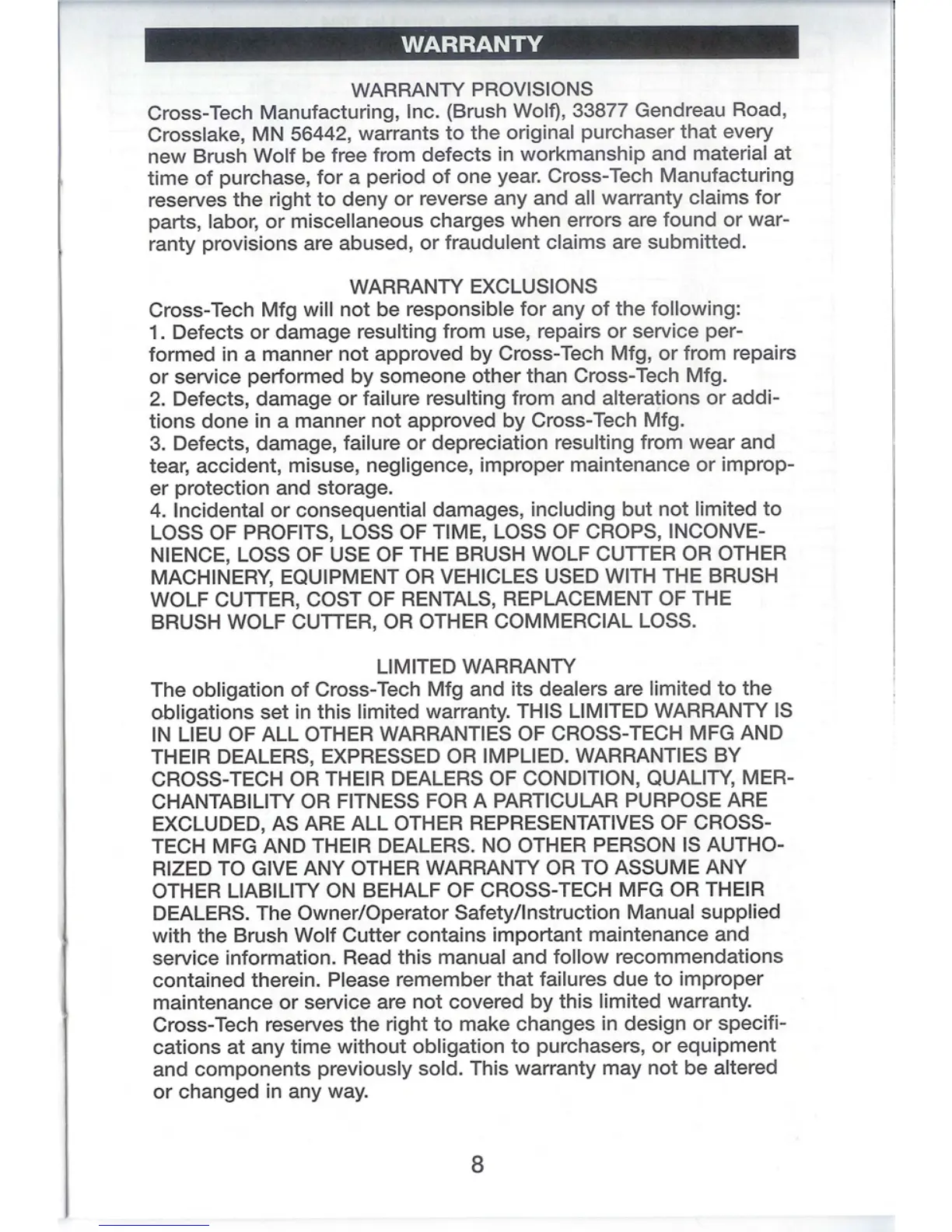 Brush Wolf 4200 - Warranty and Registration; Warranty Provisions; Warranty Exclusions; Limited Warranty