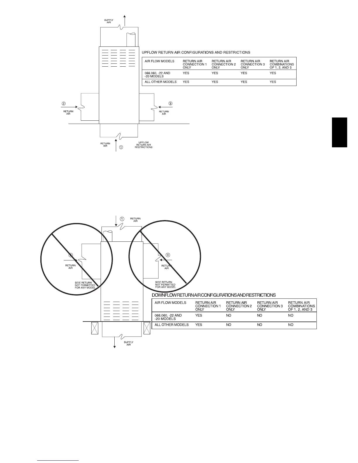 Fig. 19 -- Downflow Return Air Configurations and Restrictions