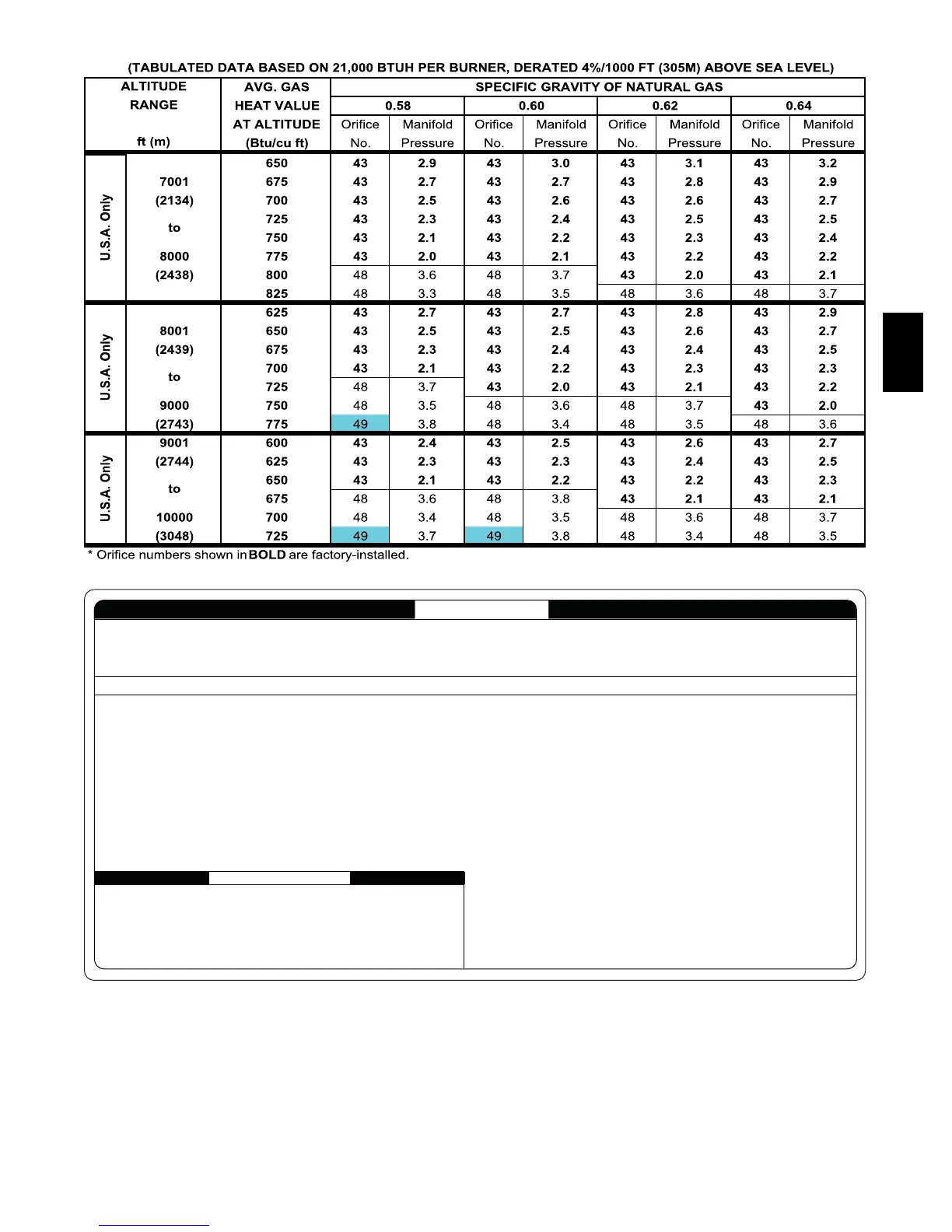 Table 14 -- Orifice Size* And Manifold Pressure (In. wc) For Gas Input Rate (CONT)