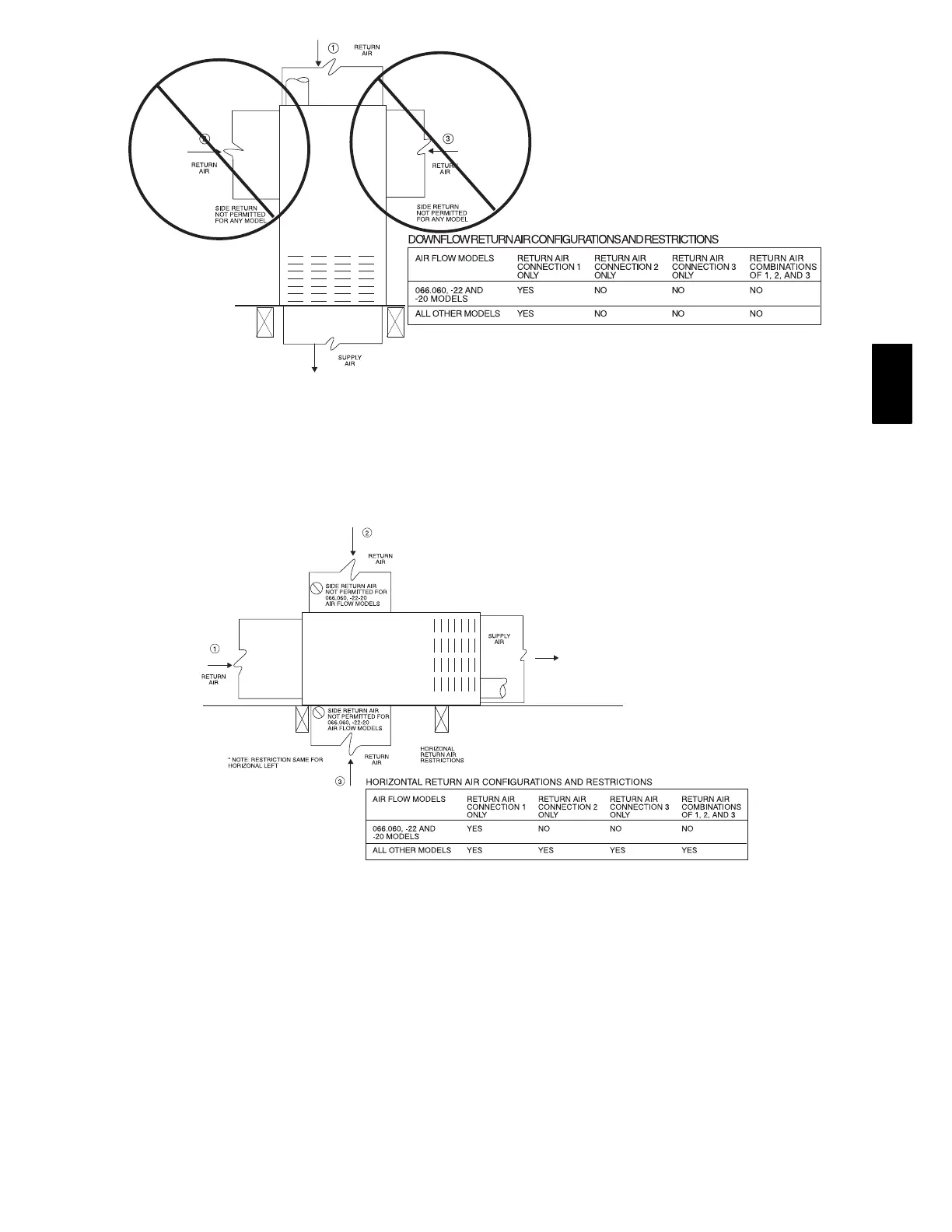Fig. 19 -- Downflow Return Air Configurations and Restrictions