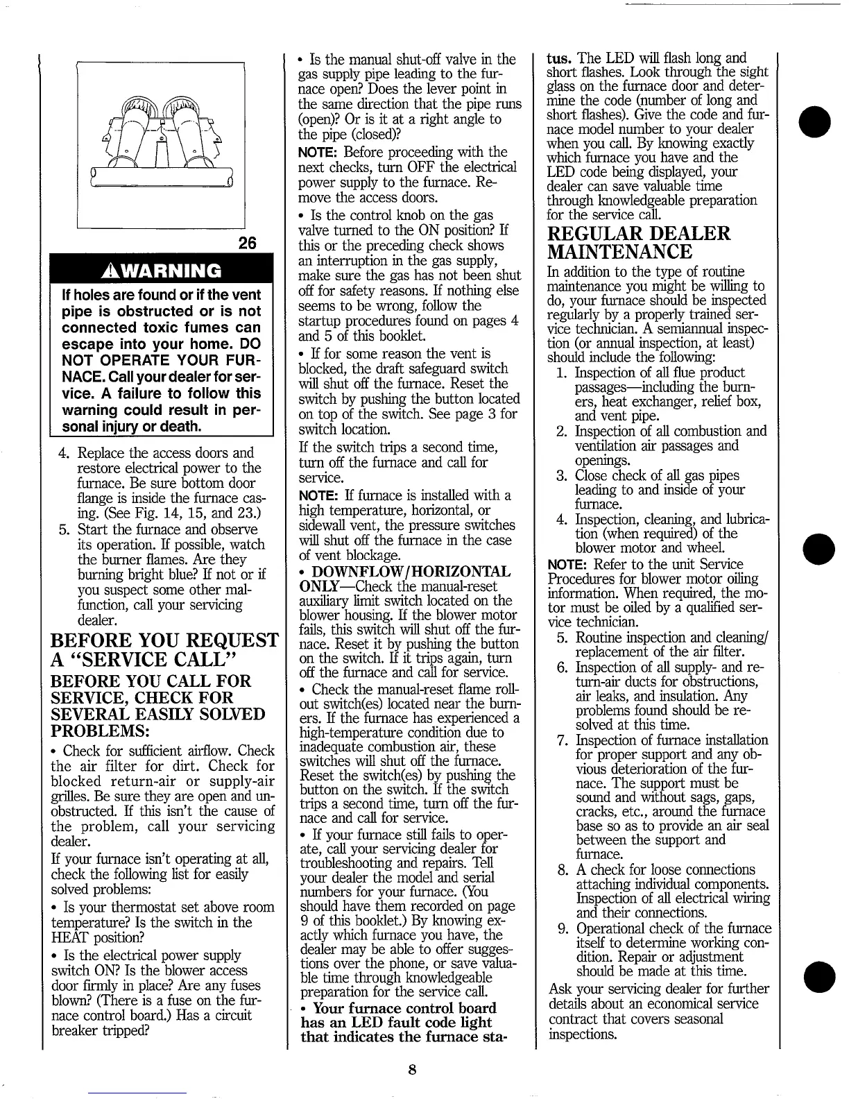 Bryant 330AAV Upflow - Troubleshooting and Dealer Service; Before Requesting a Service Call; Regular Dealer Maintenance Schedule