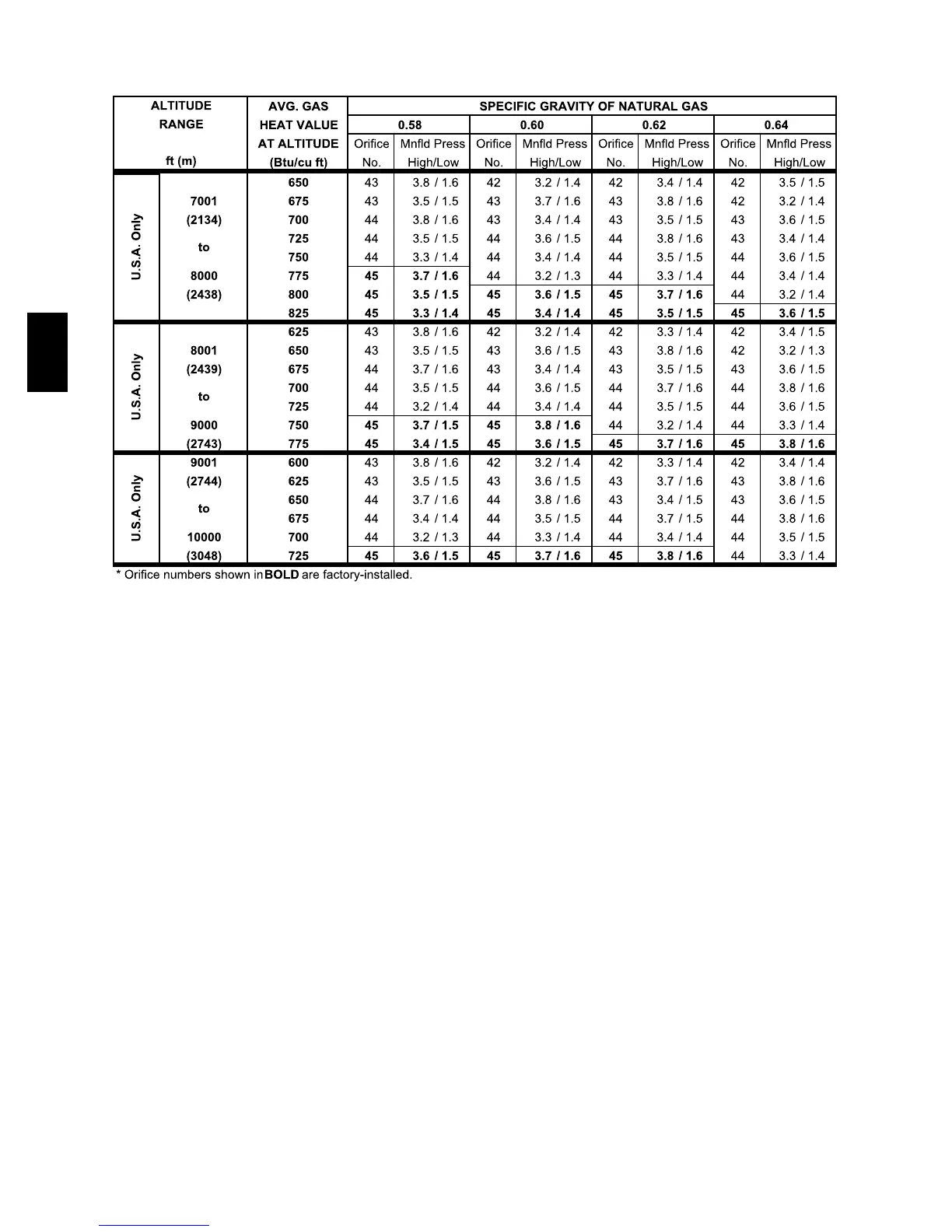Table 14 Orifice Size* and Manifold Pressures for Gas Input Rate