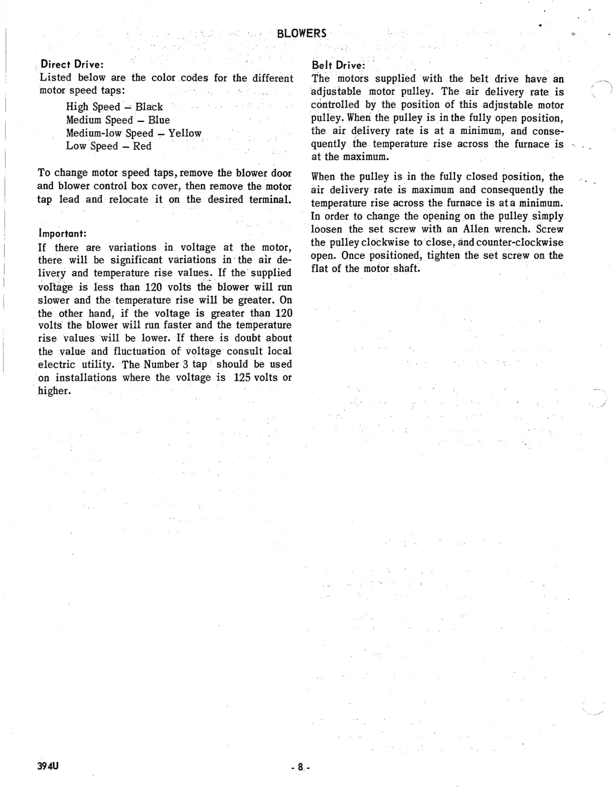 Bryant 394U - Blower Operation and Speed Adjustment