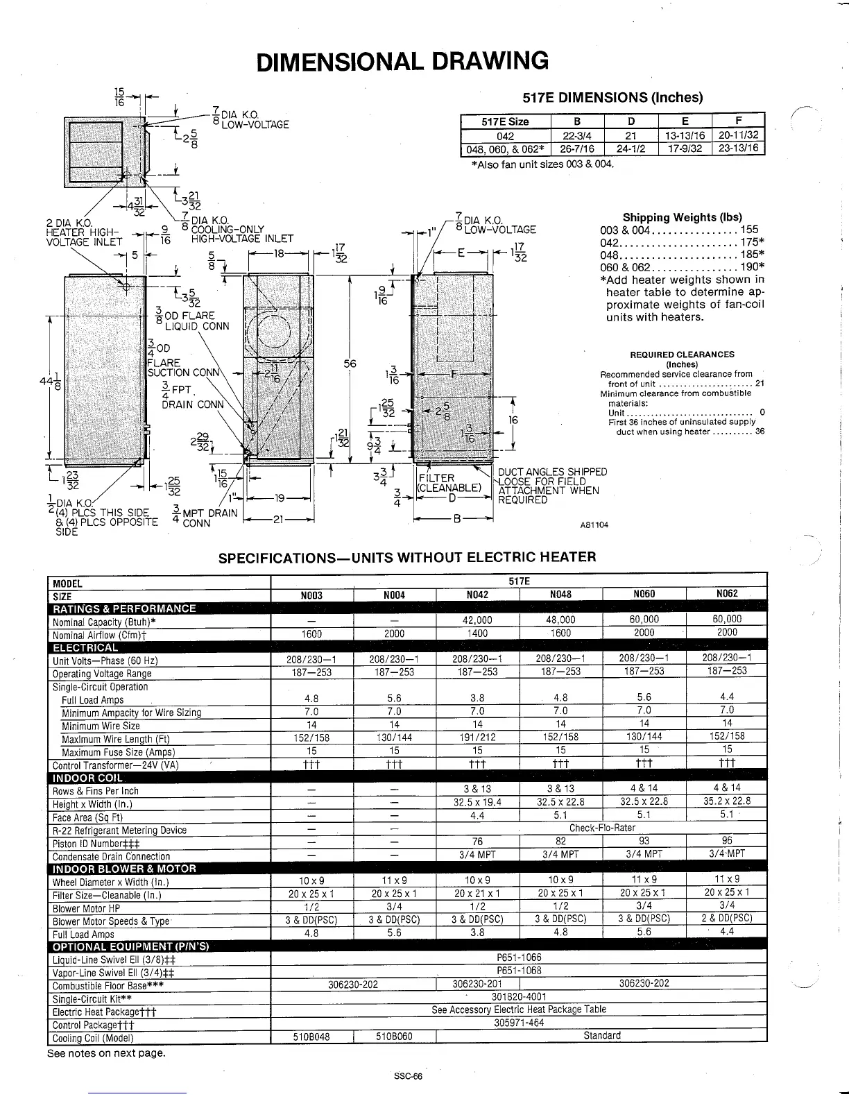 Bryant 517E - Dimensional Drawing and Specifications; 517 E Dimensions; Shipping Weights; Required Clearances